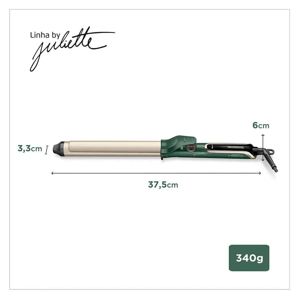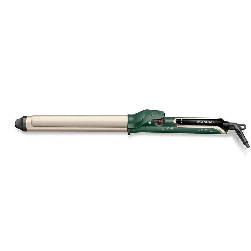 Modelador de Cachos By Juliette Mondial Verde Oliva 70W Bivolt O Modelador de Cachos da Linha by Juliette Qu4tro Elementos traz um revestimento especial enriquecido com infusao de Ceramica, Titanio, Tourmaline e Nano Silver. Esses 4 elementos, juntos, protegem seus fios e garantem uma aparencia mais saudavel aos cabelos, com brilho intenso, maciez e sem frizz. Caracteristicas: - Ceramica. Garante uma melhor distribuicao do calor e contribui para uma modelagem rapida e mais saudavel. - Titanio. Tecnologia que age na umidade dos cabelos e reduz o tempo de modelagem, alem de eliminar o efeito frizz. - Tourmaline. Fonte natural de ions negativos, que eliminam o frizz e garantem mais brilho. - Nano Silver. Particulas de prata que ajudam a inibir a acao de bacterias, contribuindo para a protecao dos fios e do couro cabeludo. - TUBO COM DIAMETRO DE 28mm. O modelador e ideal para fazer ondas e cachos mais largos. - TUBO MAIS LONGO. Indicado para todos os comprimentos de cabelos, inclusive os mais compridos. - PAINEL DIGITAL COM CONTROLE DE TEMPERATURA. 5 opcoes de 1200C a 2200C, para uma modelagem perfeita e adequada aos diferentes tipos de cabelo. - BIVOLT. Pode ser utilizada em ambas voltagens: 127V e 220V. Liberdade de usar sua prancha em qualquer lugar! - CABO GIRATORIO DE 2,5 METROS. O cabo-plugue tem 2,5m de comprimento e gira 3600 garantindo mais autonomia de movimento. Especificacoes: - Marca: Mondial - Modelo: By Juliette - Cor: Verde Oliva - Voltagem: Bivolt - Controle de temperatura: Sim - Cabo giratorio: Sim - Tecnologias (emite ions): Nao - Revestimento: Ceramica, Titanio, Tourmaline e Nano Silver Dimensoes do produto: - (CxLxA): 37 x 3 x 6cm - Diametro: 28 mm - Peso do produto: 0,340Kg Conteudo da embalagem: - 1 Modelador de cachos Juliette Mondial - 1 Manual de instrucoes
