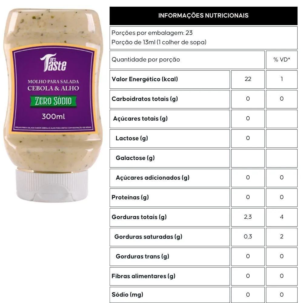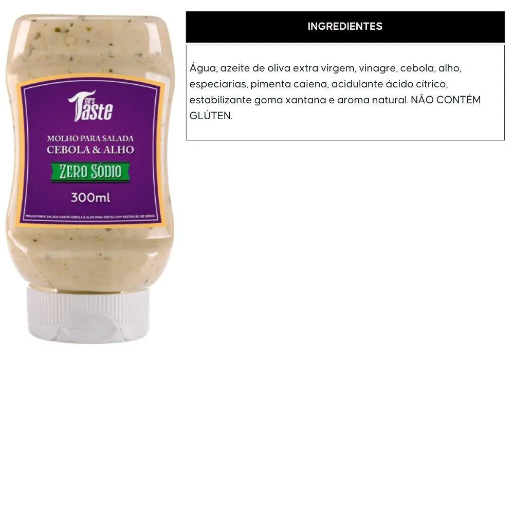 O Molho Para Salada Cebola e Alho da Mrs Taste foi criado para quem ama sabor, mas não abre mão de fazer escolhas inteligentes. É a tranquilidade de temperar sua salada, seus grelhados e legumes à vontade, sem se preocupar com a ingestão de sódio. Além disso, a fórmula é "clean label": zero açúcar, sem conservantes, sem óleo de palma, sem glúten e zero lactose. Uma receita pura, simples e 100% vegana para todos os estilos de vida.