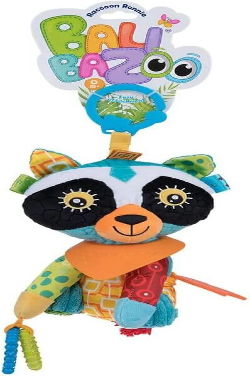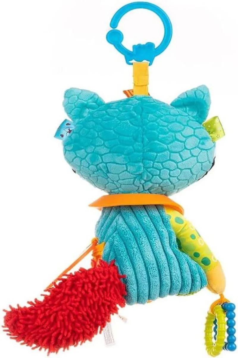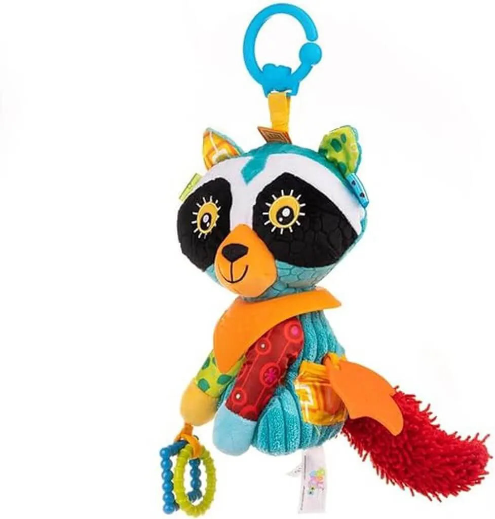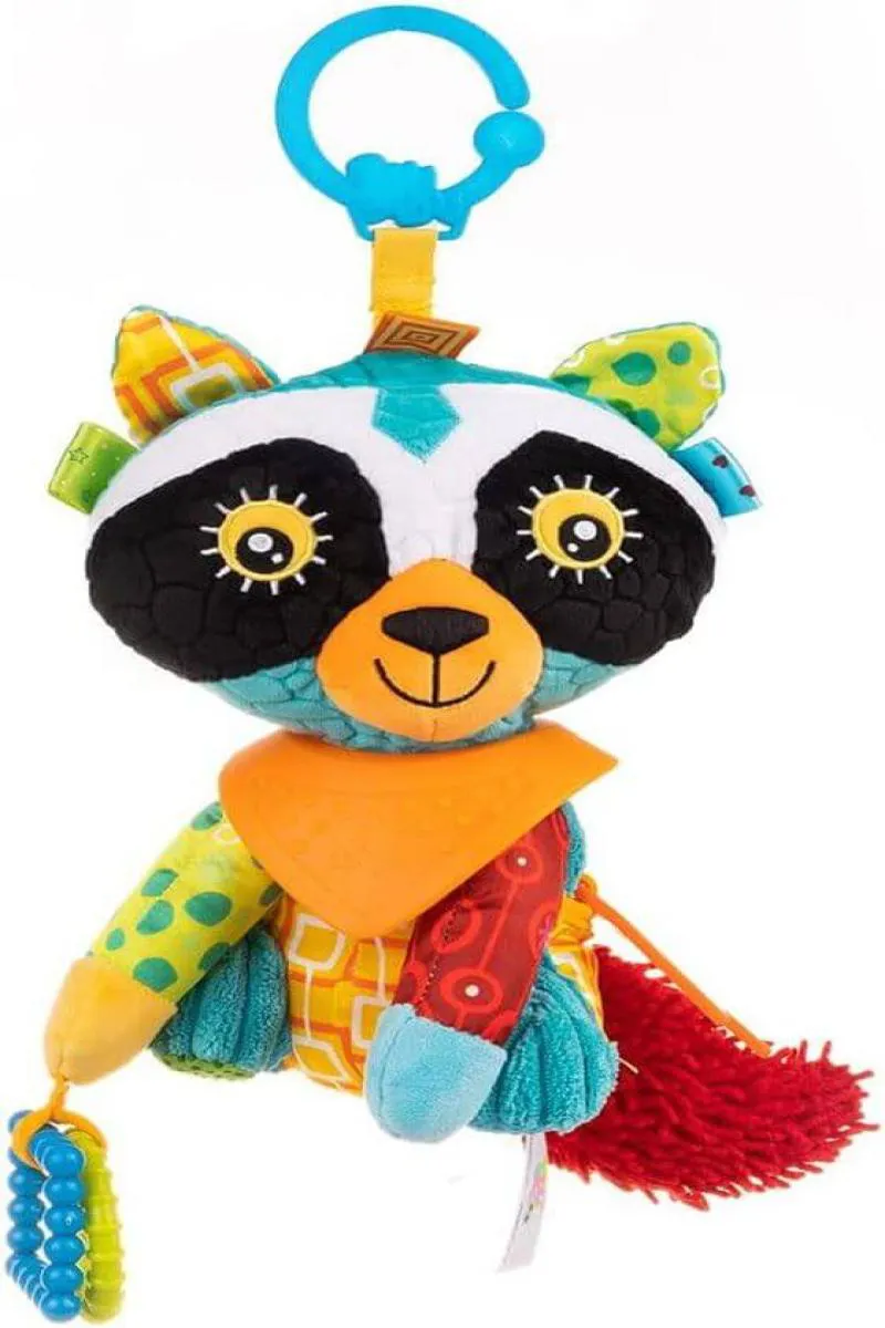 É um brinquedo de dentição infantil em formato de guaxinim, confeccionado em fibra de poliéster antialérgico, com design colorido, texturizado e com bandana. O produto possui um mordedor embutido e diferentes texturas, projetado especificamente para bebês a partir de 2 meses de idade.