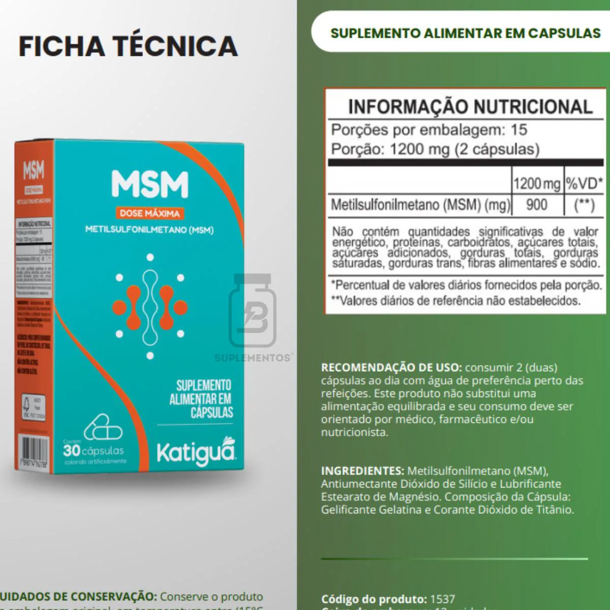 Suplemento alimentar com MSM (metilsulfonilmetano), fonte natural de enxofre orgânico, que pode contribuir para a saúde das articulações e tecidos conjuntivos.Benefícios: