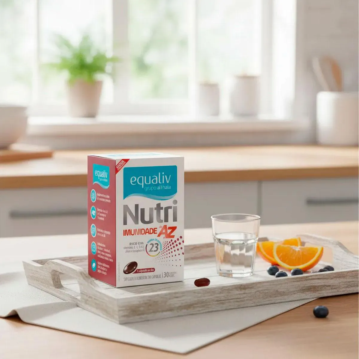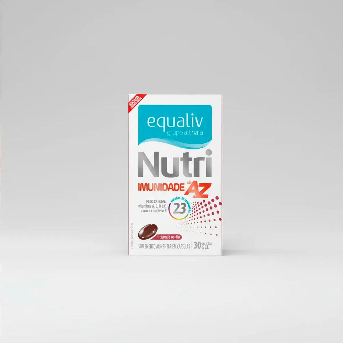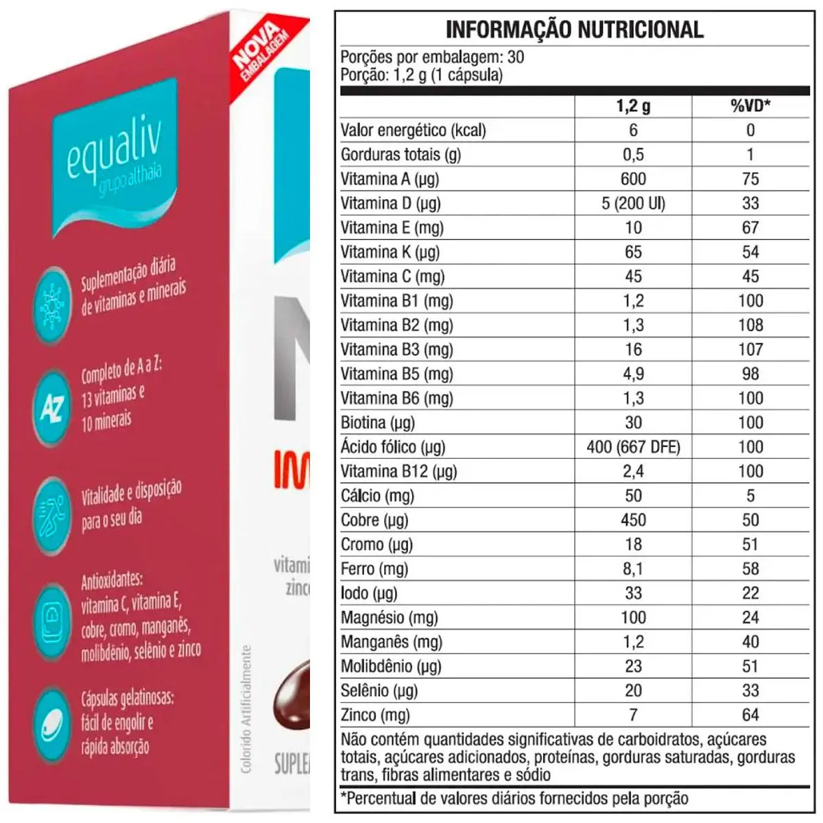 Nutri imunidade A-Z Equaliv Nutri Imunidade é um polivitamínico formulado para oferecer vitaminas e minerais de alta qualidade que o corpo precisa todos os dias. Uma fórmula balanceada que oferece uma nutrição completa na dose certa. Equaliv Nutri Imunidade é um polivitamínico de A a Z formulado para atender as mudanças no padrão alimentar da população. Decorrentes das transformações no estilo de vida, os suplementos vitamínicos e alimentos enriquecidos tornaram-se veículos práticos de micronutrientes, sendo fundamentais para a manutenção do equilíbrio nutricional para uma vida saudável. Com antioxidantes em sua composição (vitamina e, manganês, cobre, selênio), protege as células contra ação dos radicais livres, acrescenta em vitalidade (vitaminas do complexo B, ferro), entre outros benefícios. Modo de uso: Consumir 1 (uma) cápsula ao dia. Ingredientes: Óxido de magnésio, carbonato de cálcio, ácido ascórbico, niacinamida, DL-alfa- tocoferil, fumarato ferroso, óxido de zinco, pantotenato de cálcio, riboflavina, cloridrato de piridoxina, nitrato de tiamina, sulfato de manganês, palmitato de retinol, óxido cúprico, ácido fólico, fitomenadiona, cloreto de sódio, iodeto de potássio, biotina, molibdato de sódio, selenito de sódio, cloreto de cromo III, citrato de potássio, colecalciferol, cianocobalamina, veículos óleo de soja e maltodextrina, (emulsificantes) lecitina de soja, mono e diglicerídeos de ácidos graxos, (glaceante) cera de abelha branca. Cápsula: (gelificante) gelatina, (umectantes) glicerol e sorbitol, (corantes) dióxido de titânio, óxido de ferro preto, amarelo crepúsculo, vermelho ponceau 4R e óxido de ferro vermelho. “NÃO CONTÉM GLUTEN.” Advertências: "ESTE PRODUTO NÃO É UM MEDICAMENTO" "ESTE PRODUTO É UM SUPLEMENTO ALIMENTAR" "MANTENHA FORA DO ALCANCE DE CRIANÇAS" "NÃO EXCEDER A RECOMENDAÇÃO DIÁRIA DE CONSUMO INDICADA NA EMBALAGEM" Registro no M.S. nº Produto dispensado de registro RDC 240 de 2018
