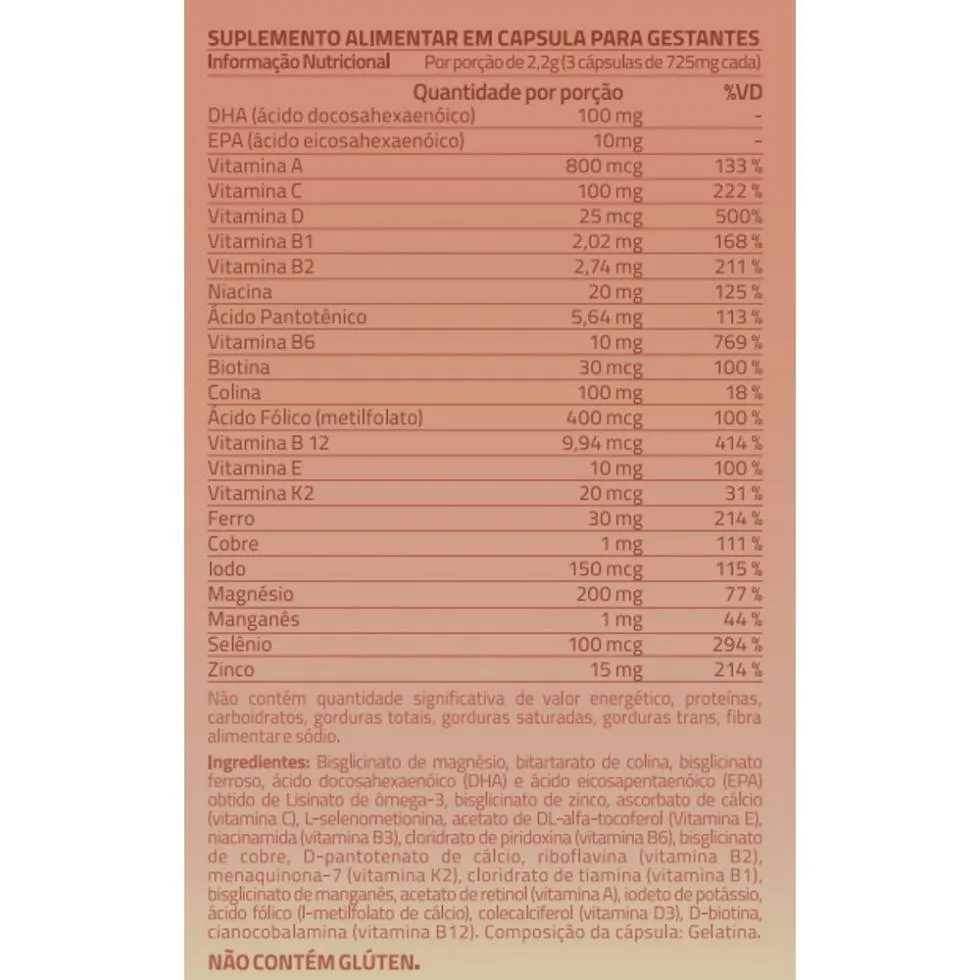 Multivitamínico Pré Natal (90 caps) Multivitamínico completo para cuidar da saúde materna durante a gestação e fornecer nutrientes essenciais para o desenvolvimento do bebê. Suplemento adequado para o neurodesenvolvimento saudável, melhora da saúde óssea e fortalecimento do sistema imunológico. São 23 vitaminas e minerais, como metilfolato e ferro, para suprir as necessidades básicas e necessárias da mãe e do bebê. Na gestação a mulher precisa de nutrientes em quantidades diferenciadas, para que ela possa garantir sua saúde e um adequado desenvolvimento do bebê. O Pré Natal Vitamin foi desenvolvido junto com especialistas na área materno infantil. Nós trouxemos nesse incrível produto a combinação dos melhores e mais potentes nutrientes para essa fase tão especial que é a gestação. Benefícios: - Multivitamínico completo para promoção da saúde materna;- Fornecimento de nutrientes essenciais para o desenvolvimento do bebê;- Quantidade recomendada de metilfolato e ferro;- Suprimento adequado para o neurodesenvolvimento saudável;- 23 vitaminas e minerais para suprir as necessidades da mãe e do bebê;- Melhora a saúde imunológica, óssea e cerebral.