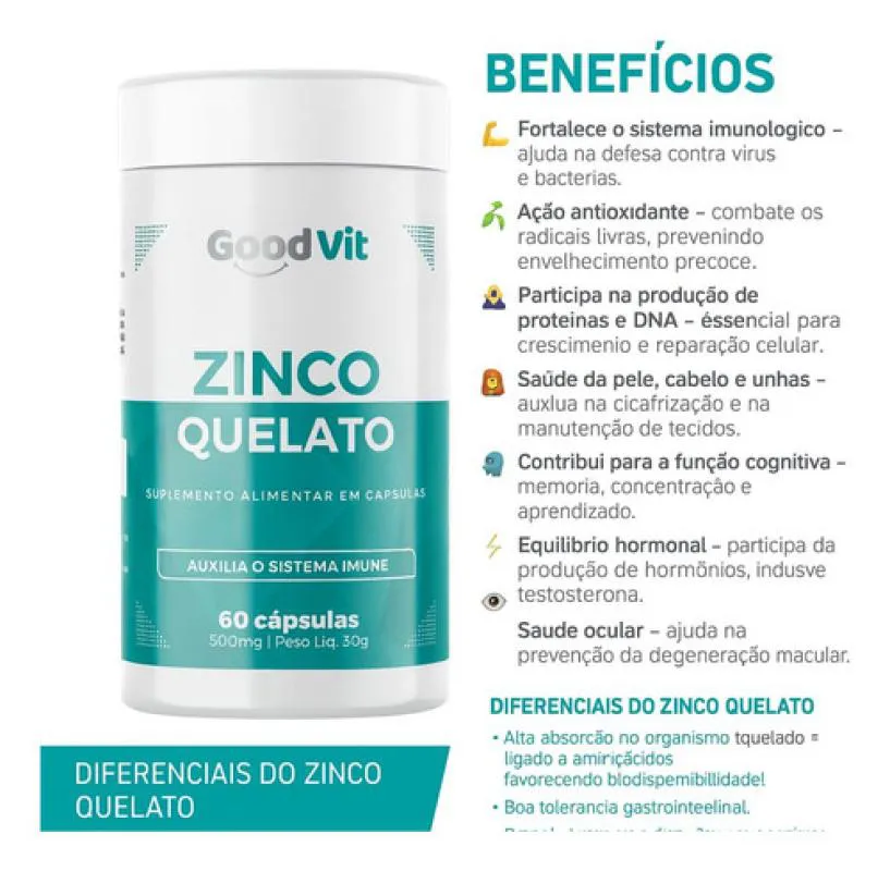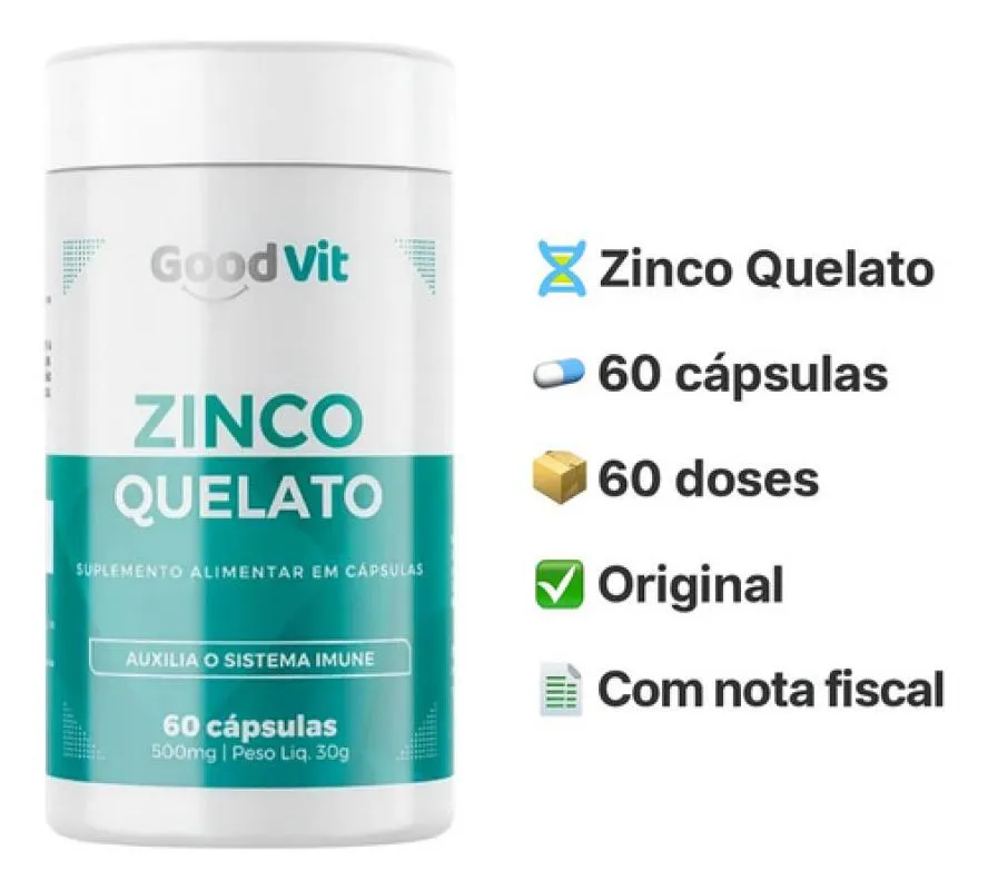 O Zinco Quelato Good Vit é um suplemento alimentar em cápsulas formulado com zinco quelato, destinado a auxiliar no fortalecimento do sistema imunológico e contribuir para diversas funções essenciais do organismo.