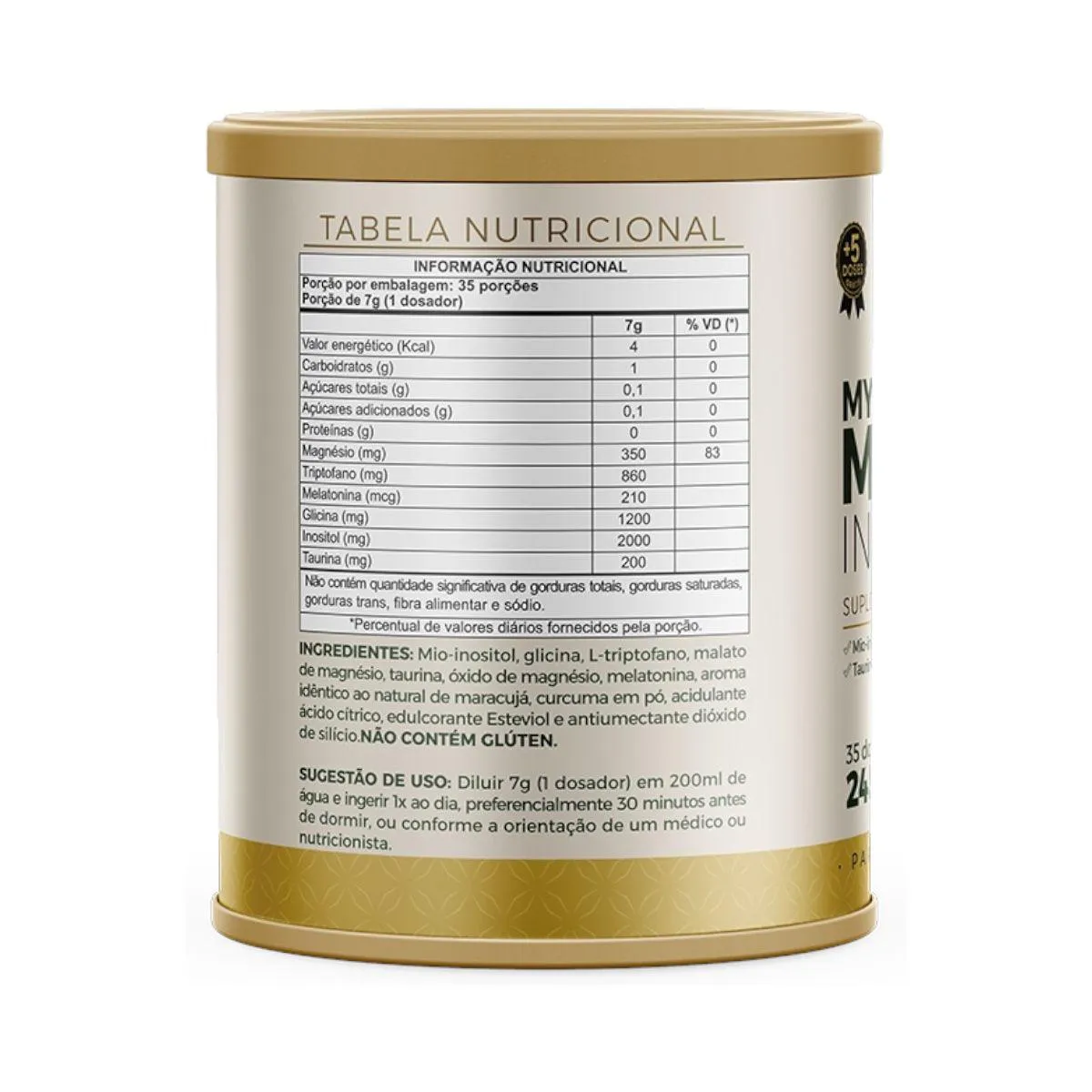 Mio-inositol, glicina, L-triptofano, malato de magnésio, taurina, óxido de magnésio, melatonina, aroma natural de maracujá, cúrcuma em pó, acidulante ácido cítrico, edulcorante glicosídeo de esteviol (estévia) e antiumectante dióxido de silício.