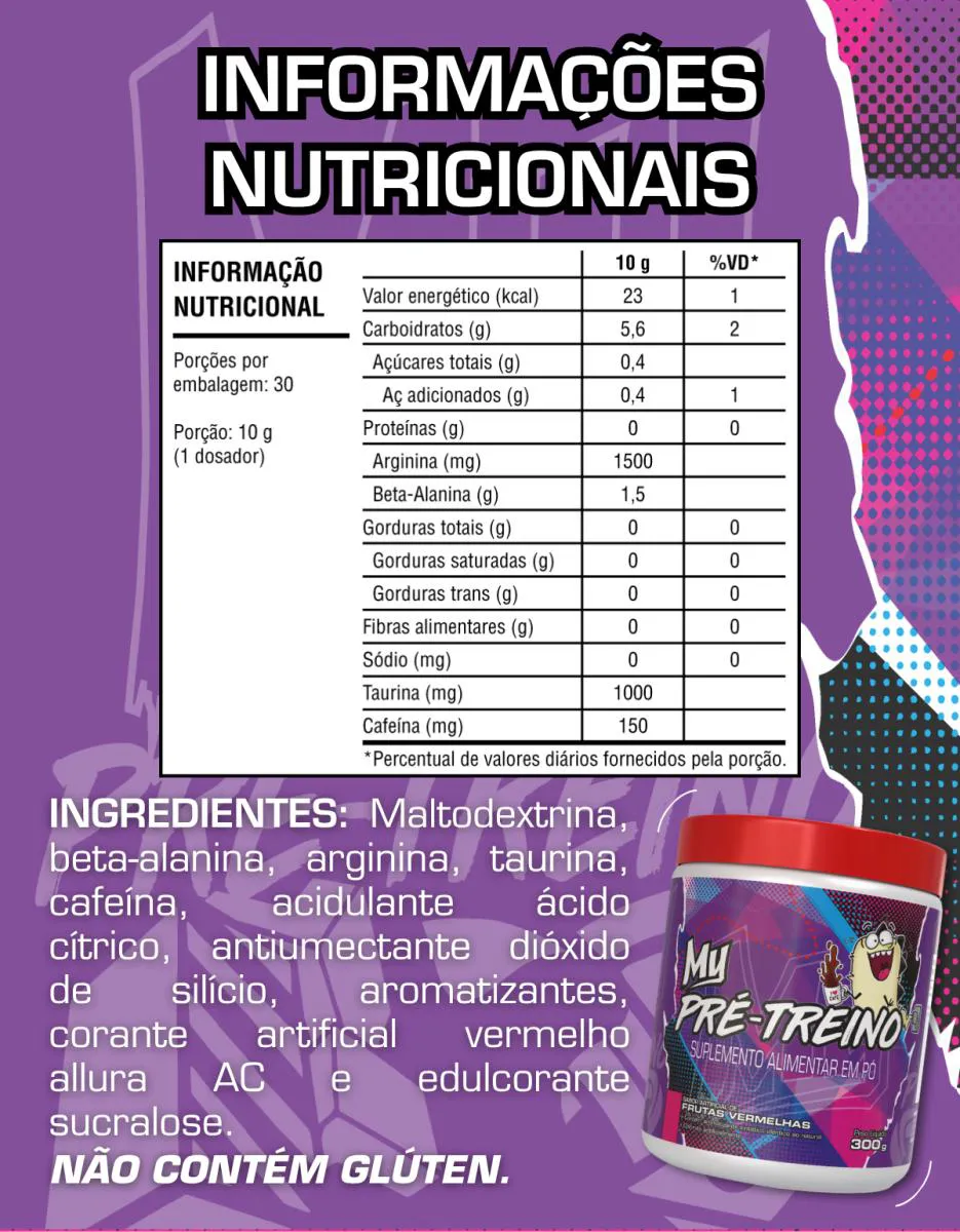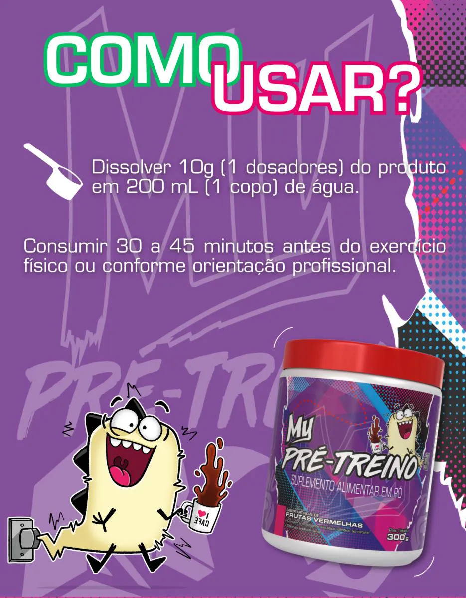 My Pré-Treino – Energia, Foco e PerformanceO My Pré-Treino é um suplemento alimentar em pó desenvolvido para quem busca mais energia, foco e desempenho físico durante os treinos. Sua fórmula combina arginina, beta-alanina, taurina e cafeína, auxiliando no aumento da disposição, da resistência e da intensidade nos exercícios.Cada porção fornece 1.500 mg de arginina, 1.500 mg de beta-alanina, 1.000 mg de taurina e 150 mg de cafeína, contribuindo para melhor vasodilatação, redução da fadiga muscular e maior estado de alerta. Produto indicado para treinos de alta intensidade e para quem busca performance consistente.Disponível no sabor frutas vermelhas, mantendo o padrão de qualidade da linha My Suplementos.Recomendação de uso: