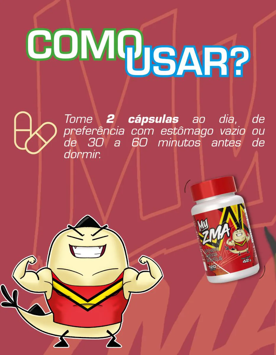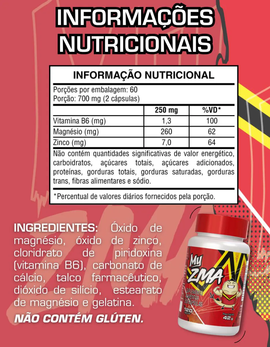 My ZMA – My SuplementosO My ZMA da My Suplementos é um suplemento alimentar em cápsulas formulado com magnésio, zinco e vitamina B6, nutrientes amplamente utilizados para complementar a ingestão diária desses minerais e vitaminas essenciais. É indicado para uso em rotinas de treino e práticas esportivas, bem como para suporte nutricional diário.Cada porção fornece 260 mg de magnésio, 7 mg de zinco e 1,3 mg de vitamina B6, mantendo uma formulação equilibrada e prática para consumo em cápsulas. Produto desenvolvido para uso contínuo, conforme orientação de consumo.Disponível na versão com 120 cápsulas, mantendo o padrão de qualidade da linha My Suplementos.Recomendação de uso: