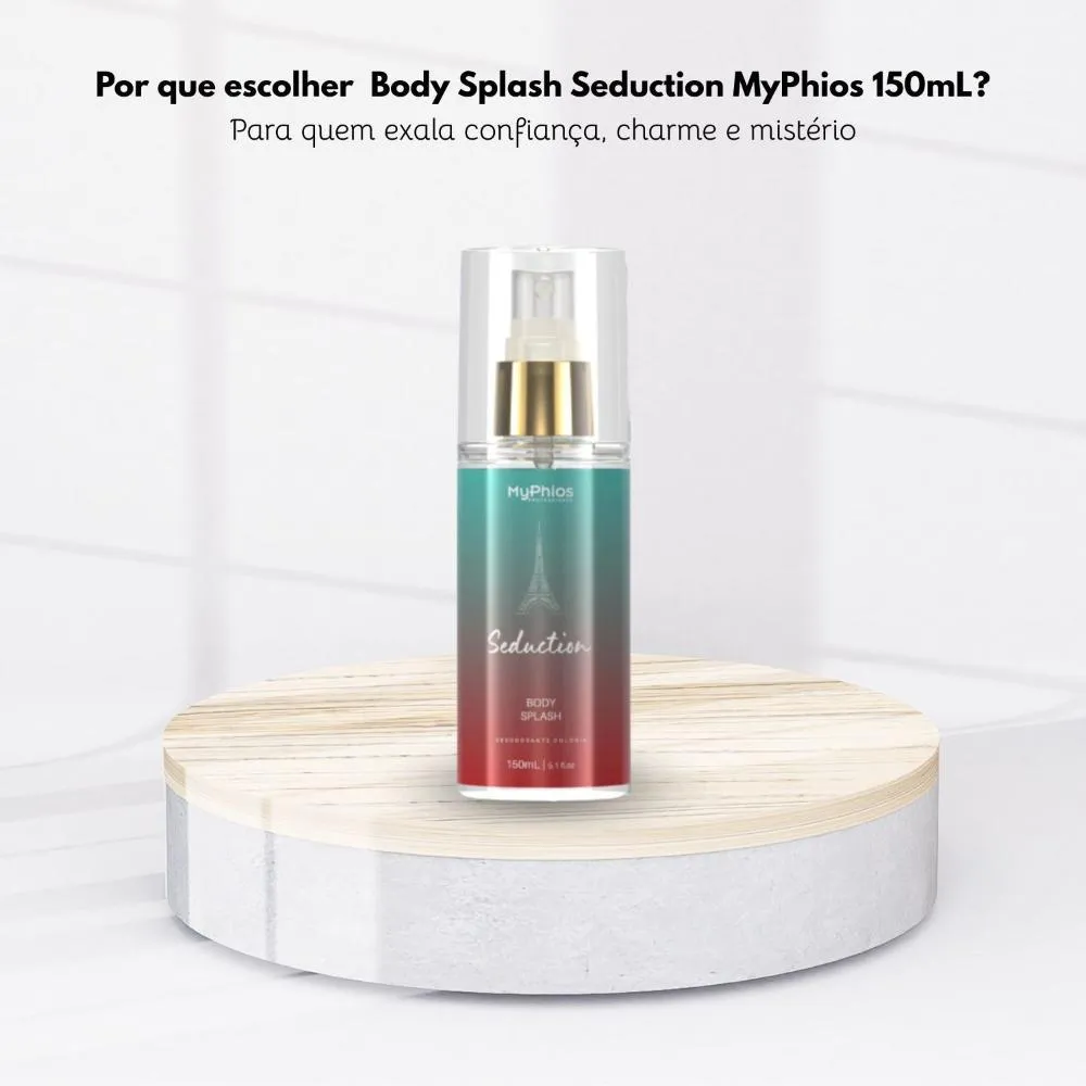 Qual a Composição? Água deionizada, álcool, glicerina, fragrância, extrato de aloe vera, conservantes. Conteúdo Adicional: O Body Splash Seduction MyPhios 150mL é perfeito para quem deseja manter a pele perfumada e fresca, garantindo um toque suave e agradável. Ideal para uso diário, combina hidratação leve com aroma envolvente, tornando-se um aliado da