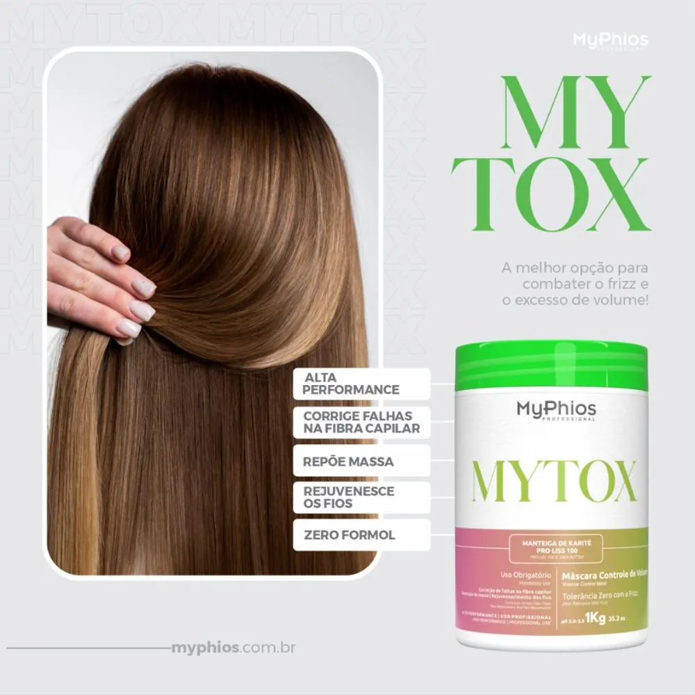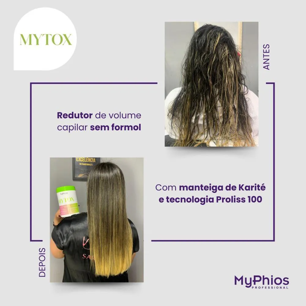 Redutor de volume capilar Myphios - Mytox: É uma máscara hidratante de alta performance, promove selagem térmica e manutenção do efeito liso. Máscara de tratamento profissional desenvolvida para Ultra Hidratação, reposição de massa e redução de volume. Experiência segura para todo tipo de