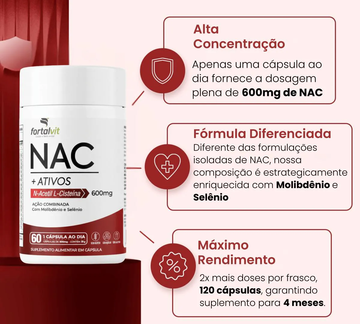NAC + Ativos – Longa Duração é um suplemento alimentar que oferece 4 meses de uso com apenas 120 cápsulas. Contém L-Acetil L-Cisteína, um poderoso antioxidante, combinada com Selênio e Molibdênio, dois minerais essenciais para o bom funcionamento do organismo. Essa fórmula exclusiva da Fortalvit auxilia na proteção das células contra danos oxidativos, contribuindo para a saúde geral. As cápsulas são fáceis de engolir e podem ser consumidas diariamente. Aproveite os benefícios desse suplemento de alta qualidade para fortalecer sua saúde e bem-estar.O QUE É O NAC?