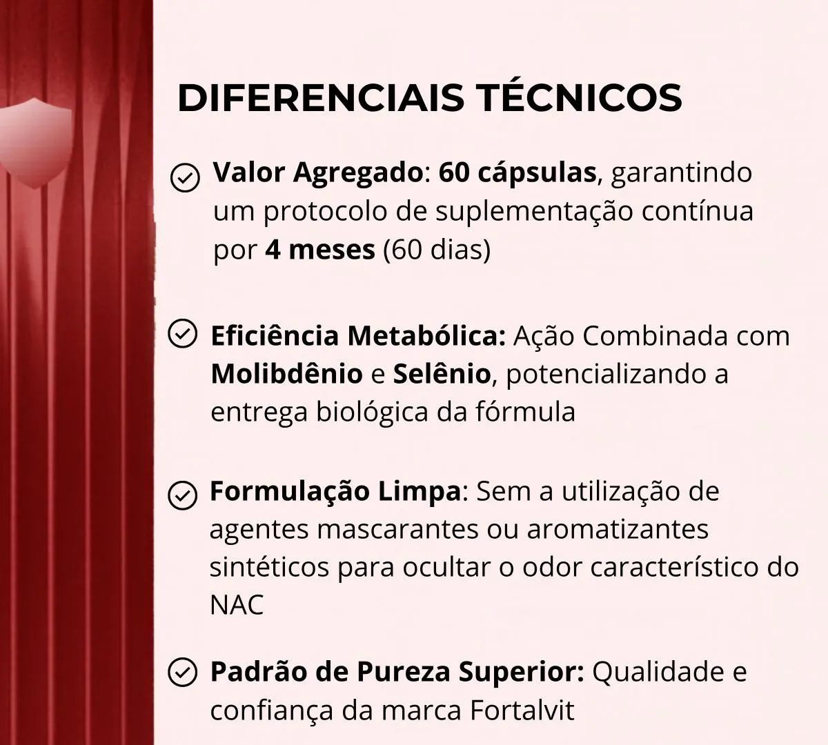 NAC + Ativos - Longa Duração: 2 meses, L-Acetil L-Cisteína com Selênio e Molibdênio, 60 Cápsulas, Fortalvit