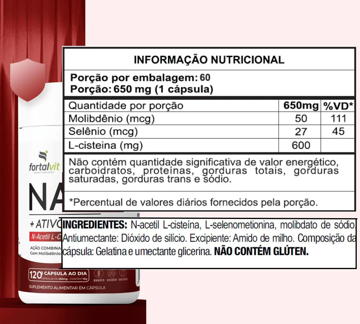 Nac 600Mg, Molibdênio e Selênio, 60 Cápsulas, Fortalvit