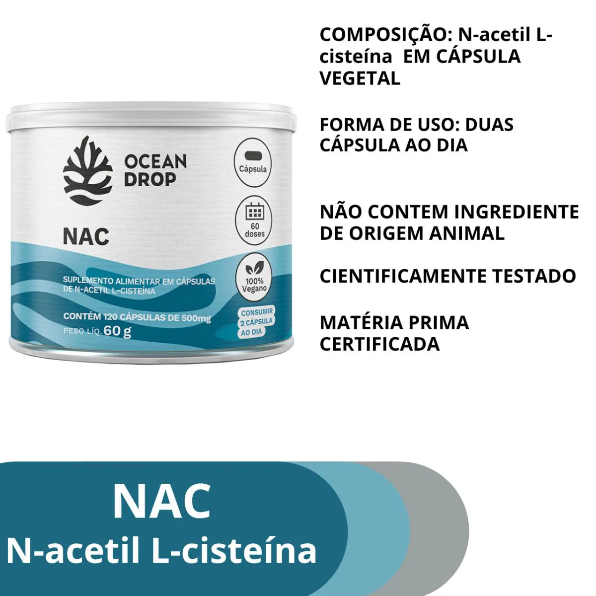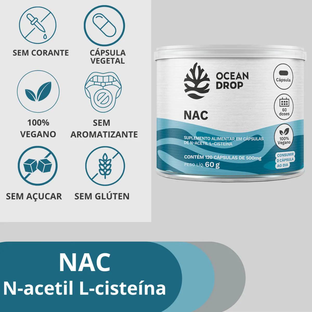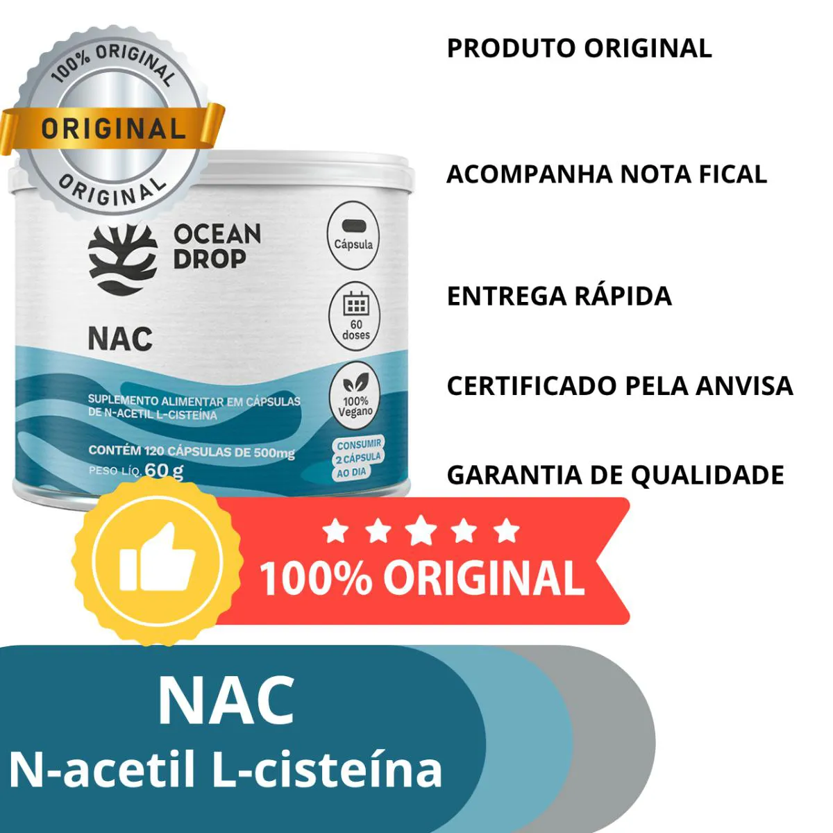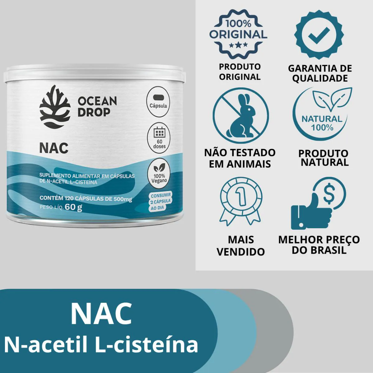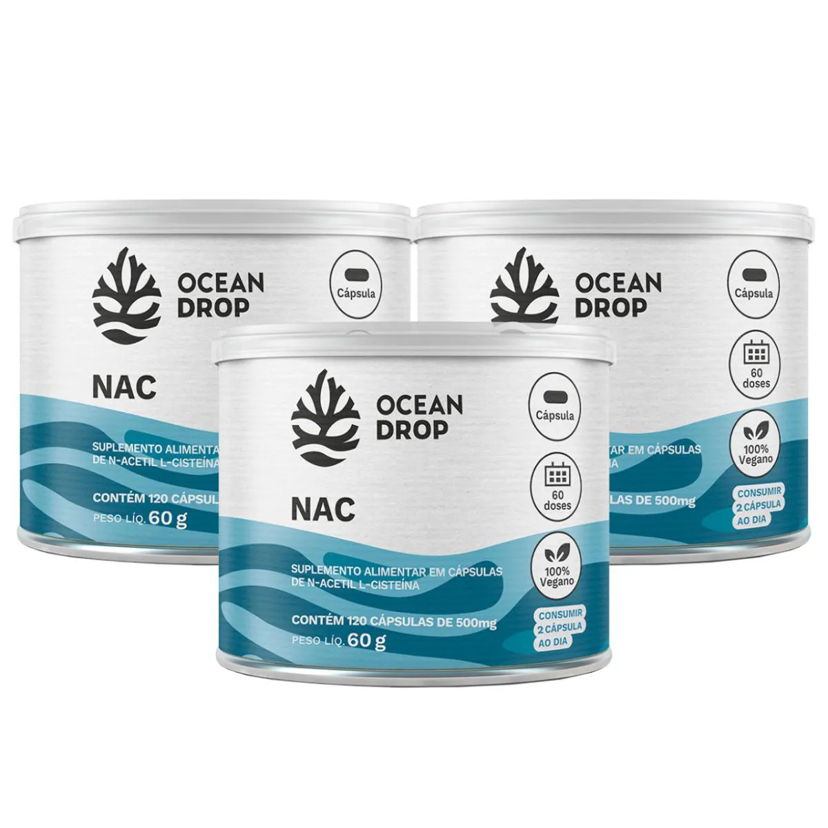 KIT 3 POTES – NAC 600mg Ocean Drop – 120 Cápsulas Cada (Total 360 Cápsulas) O NAC 600mg da Ocean Drop é um suplemento alimentar à base de N-Acetilcisteína, ideal para quem busca fortalecer o sistema imunológico, apoiar a saúde do fígado e combater os danos causados pelos radicais livres. Este kit contém 3 potes, totalizando 360 cápsulas. O que é o NAC? NAC (N-Acetilcisteína) é um aminoácido precursor da glutationa, um dos antioxidantes mais importantes do corpo. Seu uso é indicado para auxiliar na desintoxicação do organismo, proteção celular e suporte à saúde respiratória. Este anúncio contém: