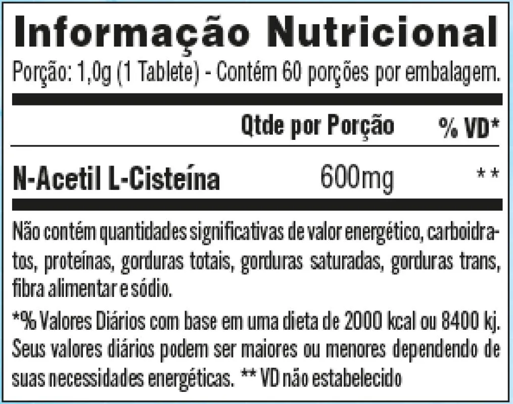 Contém 600mg de N-Acetil L-Cisteína por tableteAuxilia no rendimento esportivo promovendo a melhora da performance nos treinos;Antioxidante;NÃO CONTÉM GLÚTEN.Produto recomendado para adultos“Este produto não é um medicamento”“Este produto não deve ser consumido por gestantes, lactantes ou crianças”Embalagem com 60 tabletes;RECOMENDAÇÃO DE USO: Tomar 1 tablete ao dia antes dos exercícios físicos ou conforme a recomendação de um nutricionista e/ou médico nutrólogo.INGREDIENTES: N-Acetil L-Cisteína, Estabilizante Celulose Microcristalina e Croscarmelose Sódica, Antiaglutinante Estearato de Magnésio e Antiumectante Sílica.