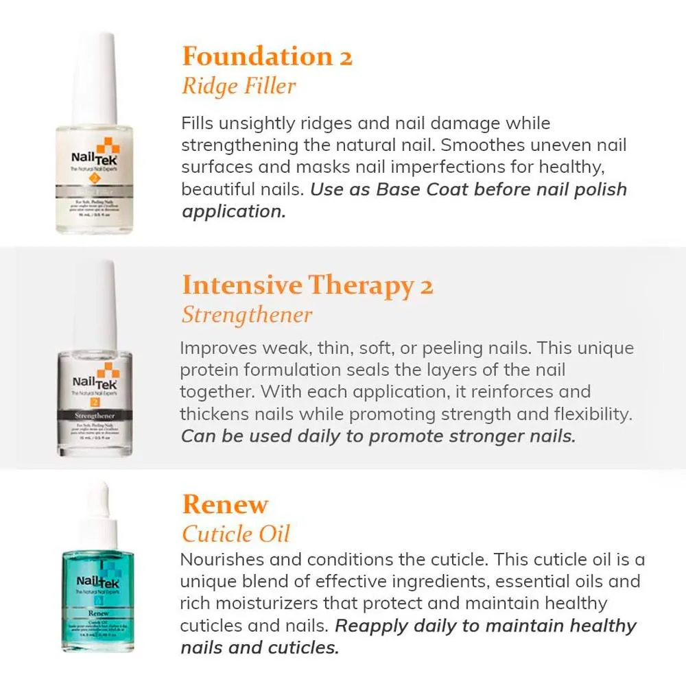 O Nail Tek Kit 3 em 1 é uma solução eficaz para restaurar unhas danificadas. Com três produtos essenciais, este kit foi desenvolvido para tratar unhas fracas, finas e danificadas, proporcionando um cuidado completo e de alta performance para unhas e cutículas. 2. Foundation 2: Preenche e Fortalece