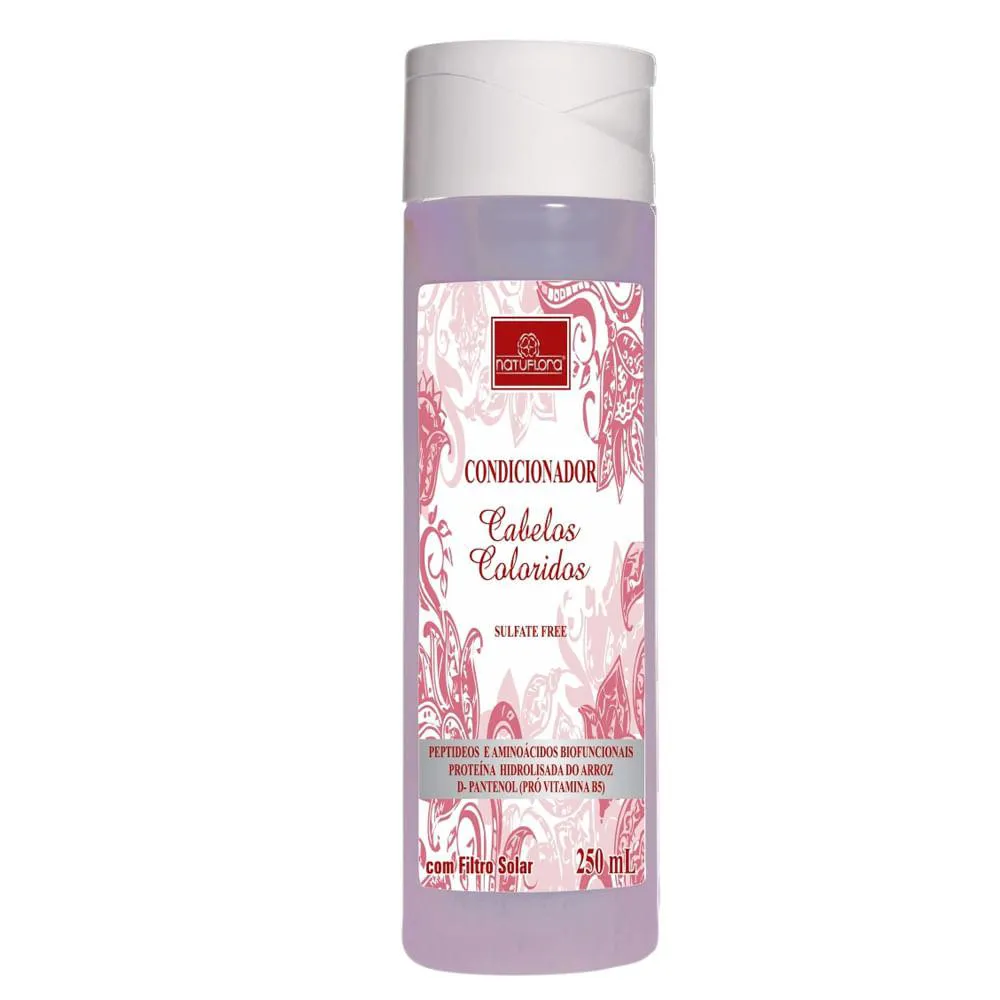 Preparado com peptídeos e aminoácidos biofuncionais, proteína hidrolisada de arroz e D-Pantenol (Pró vitamina B5), condicionador Cabelos Coloridos da Natuflora foi especialmente desenvolvido para cuidar dos cabelos danificados pelas tinturas e químicas, recupera os fios, melhorando a elasticidade, brilho e maciez. O filtro solar ajuda a prevenir os efeitos danosos dos raios solares, prolongando o tempo da coloração.