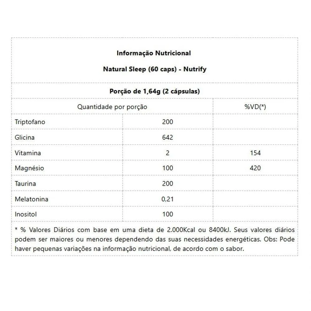 Natural Sleep (60 caps) Natural Sleep Nutrify possui em sua fórmula nobres nutrientes, em quantidades ideais para diversas funções do organismo: melatonina, triptofano, bisglicinato de magnésio, vitamina B6, taurina e inositol. O sono profundo e de qualidade é fundamental para o bem-estar e saúde plena. A sinergia dos ativos em doses puramente eficientes. No Natural Sleep, temos os ingredientes perfeitos, nas quantidades ideais. Esse é o nosso diferencial. Combinação incrível de ingredientes em doses adequadas, o que é fundamental para trazer resultados mais eficientes. Benefícios: - Melatonina;- Glicina;- Triptofano;- Magnésio;- Induz ao sono profundo;- Melhora o humor;- Contribui para um melhor rendimento físico.