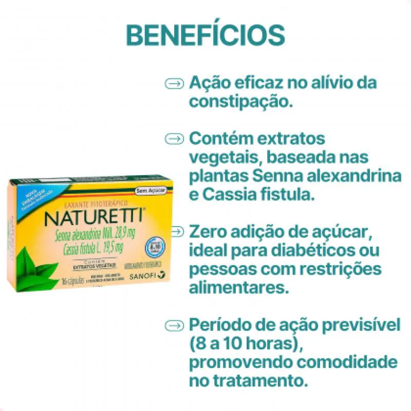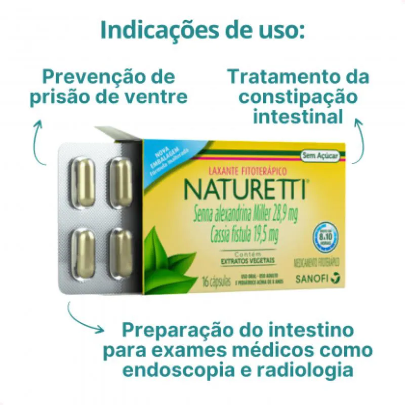 O Naturetti é um laxante fitoterápico indicado para o tratamento da prisão de ventre crônica ou momentânea, auxiliando na regulação da função intestinal.