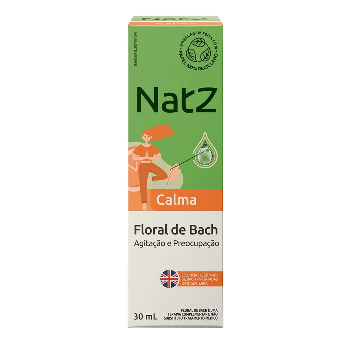 O floral de Bach Natz Calma é uma essência legítima de Bach importada da Inglaterra com embalagem feita com papel 100% reciclado e frasco com 30ml.
