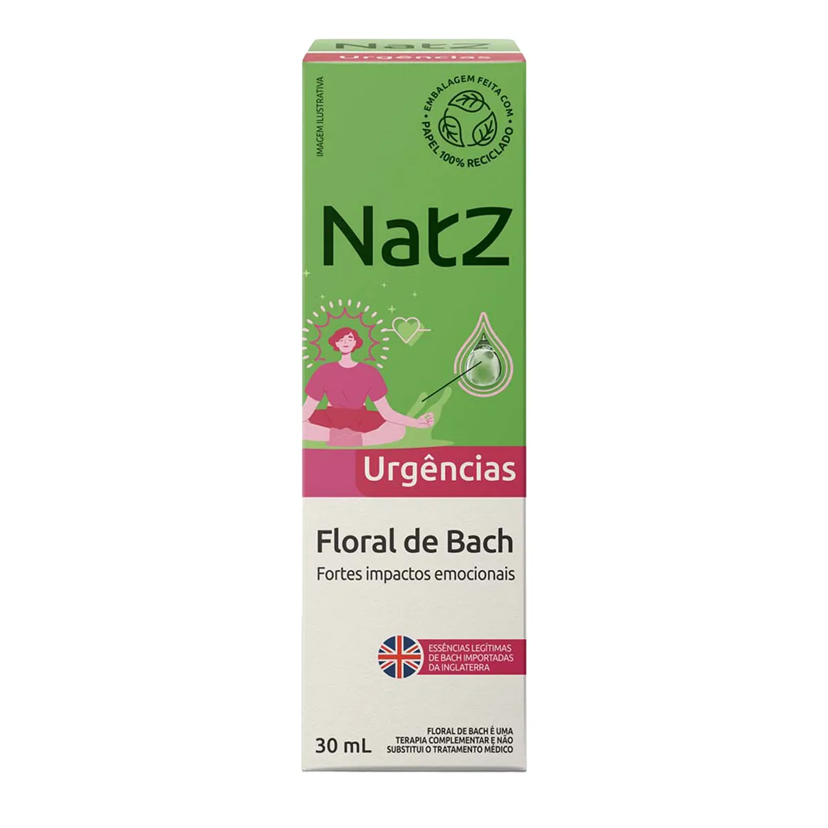 O floral de Bach Natz Urgências é uma essência legítima de Bach importada da Inglaterra em embalagem feita com papel 100% reciclado e com frasco com 30ml.