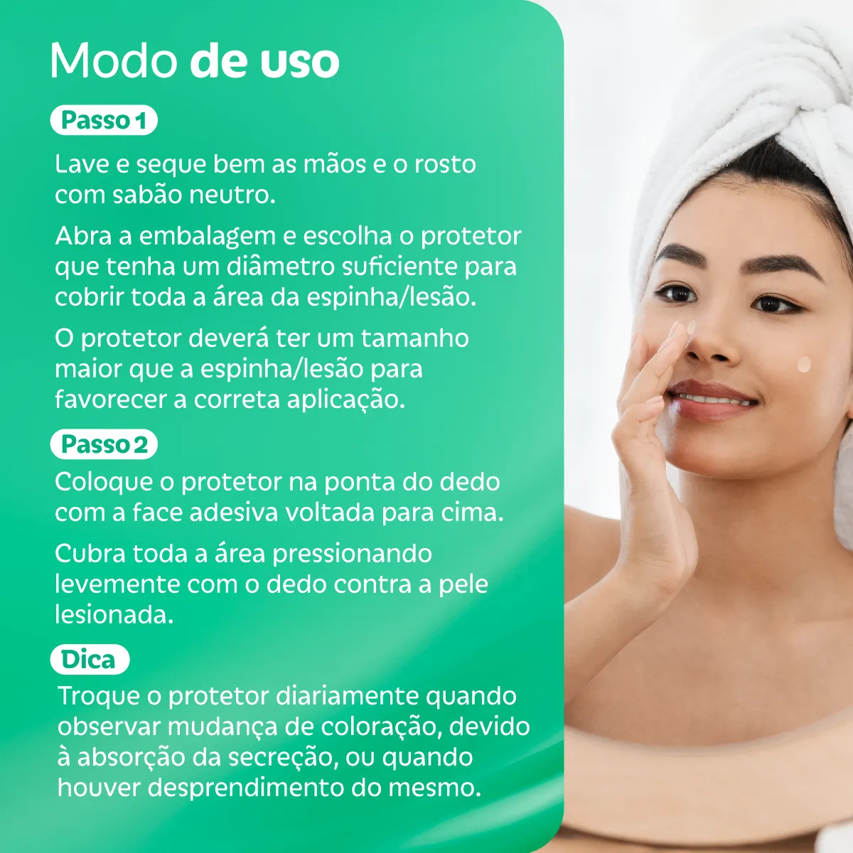 Lave e seque bem as mãos e o rosto com sabão neutro. Escolha o curativo que tenha tamanho suficiente para cobrir toda a área da espinha/lesão. Troque o curativo sempre que notar mudança de coloração devido à absorção da secreção ou quando houver descolamento.