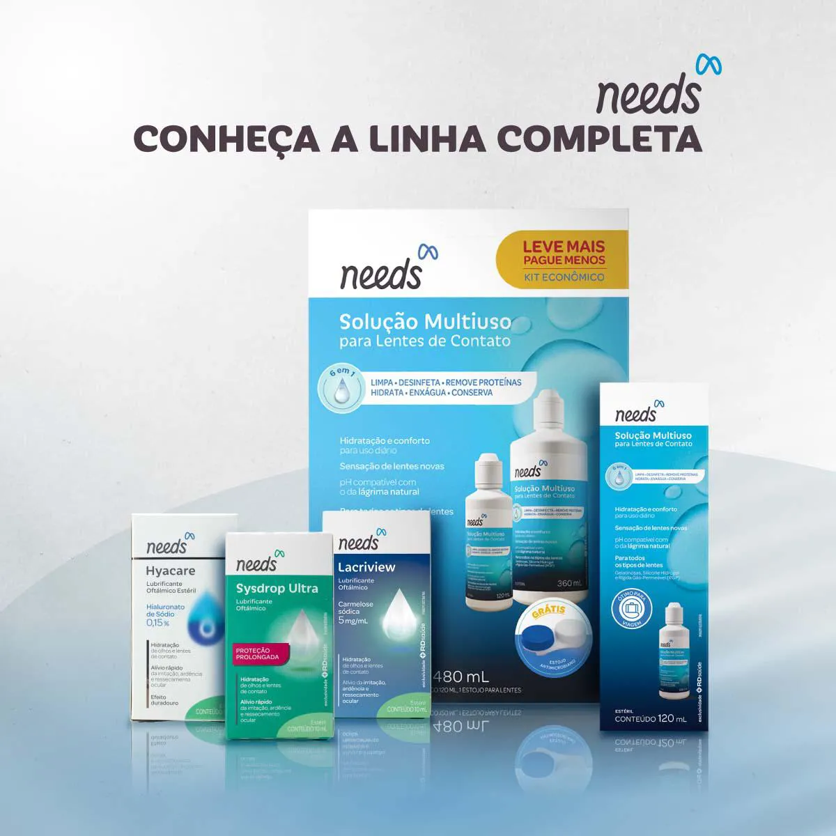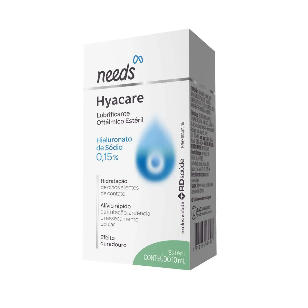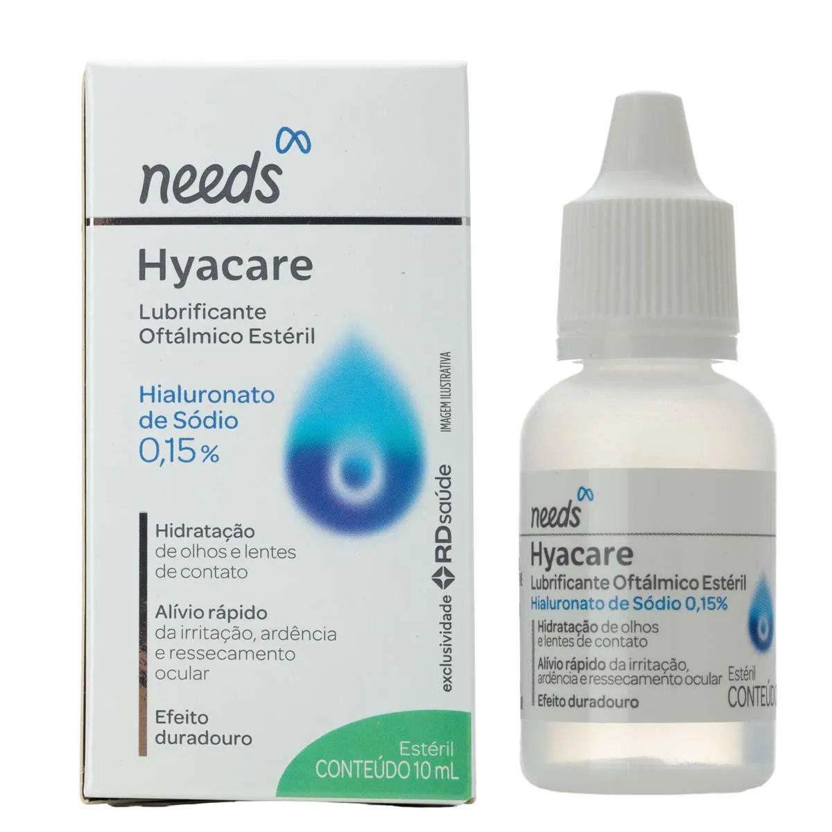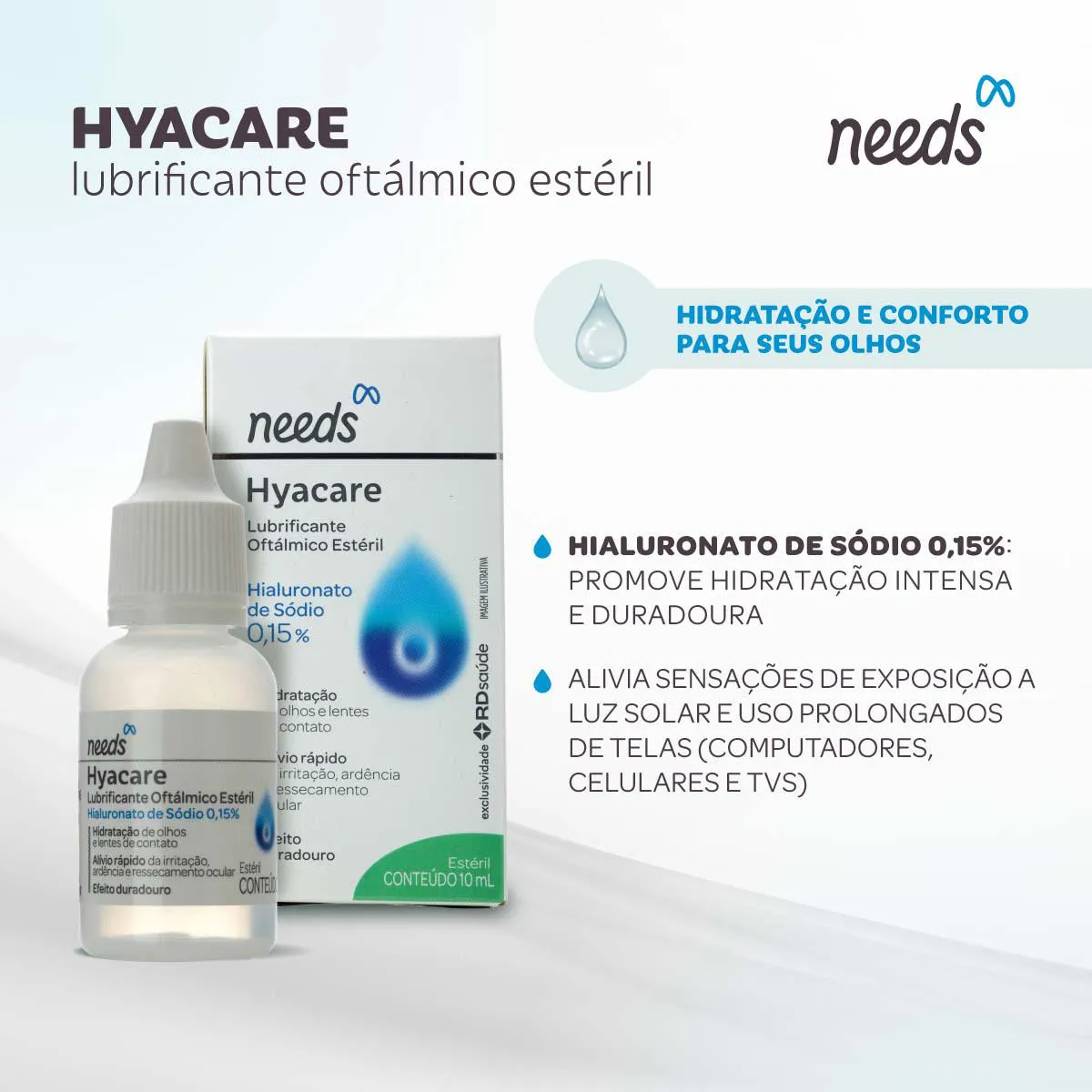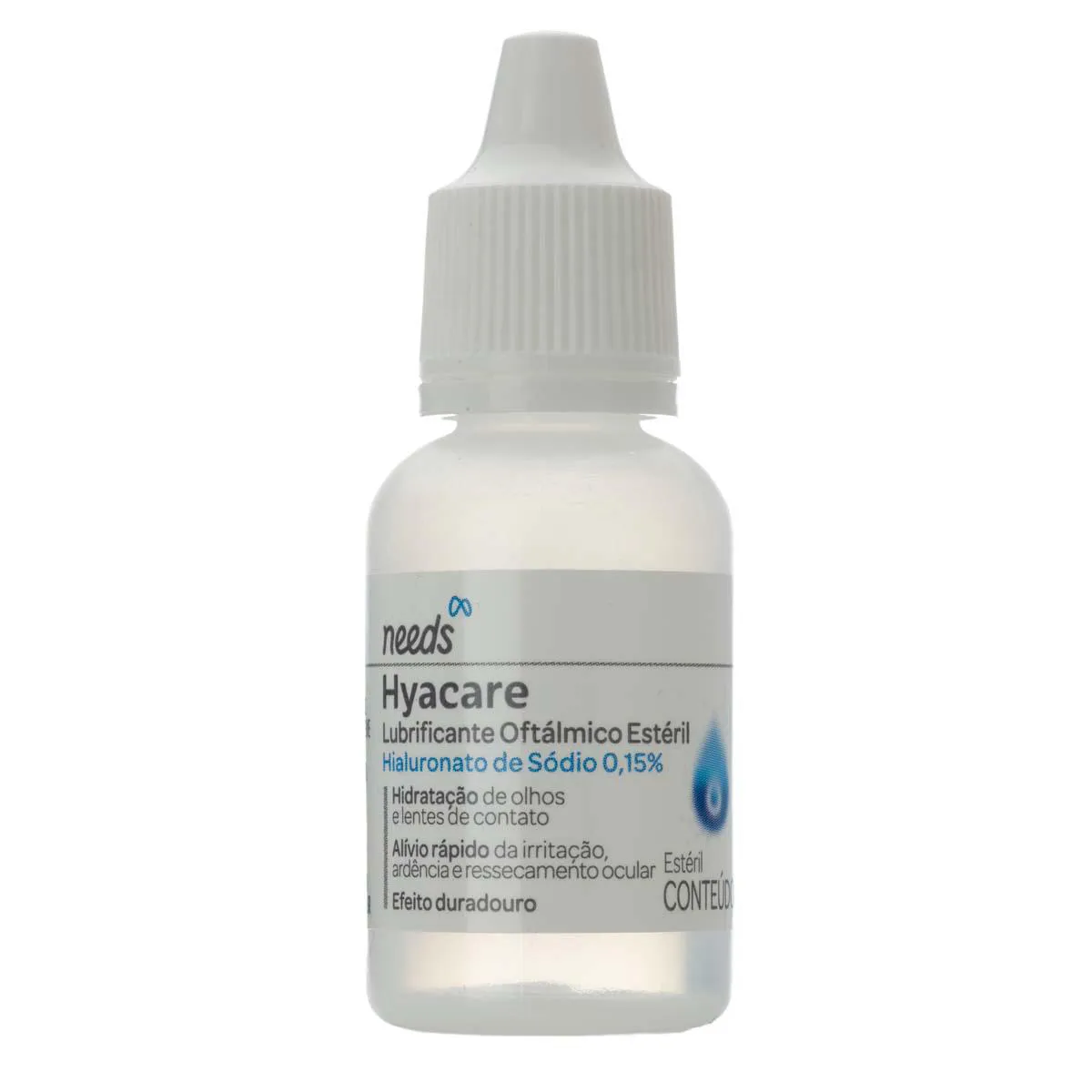Needs Hyacare é um lubrificante oftálmico estéril à base de hialuronato de sódio, desenvolvido para aliviar a sensação de secura e irritação nos olhos. É especialmente eficaz para prevenir desconfortos associados ao uso prolongado de lentes de contato e exposição a fatores ambientais como vento, fumaça, poeira e telas digitais.