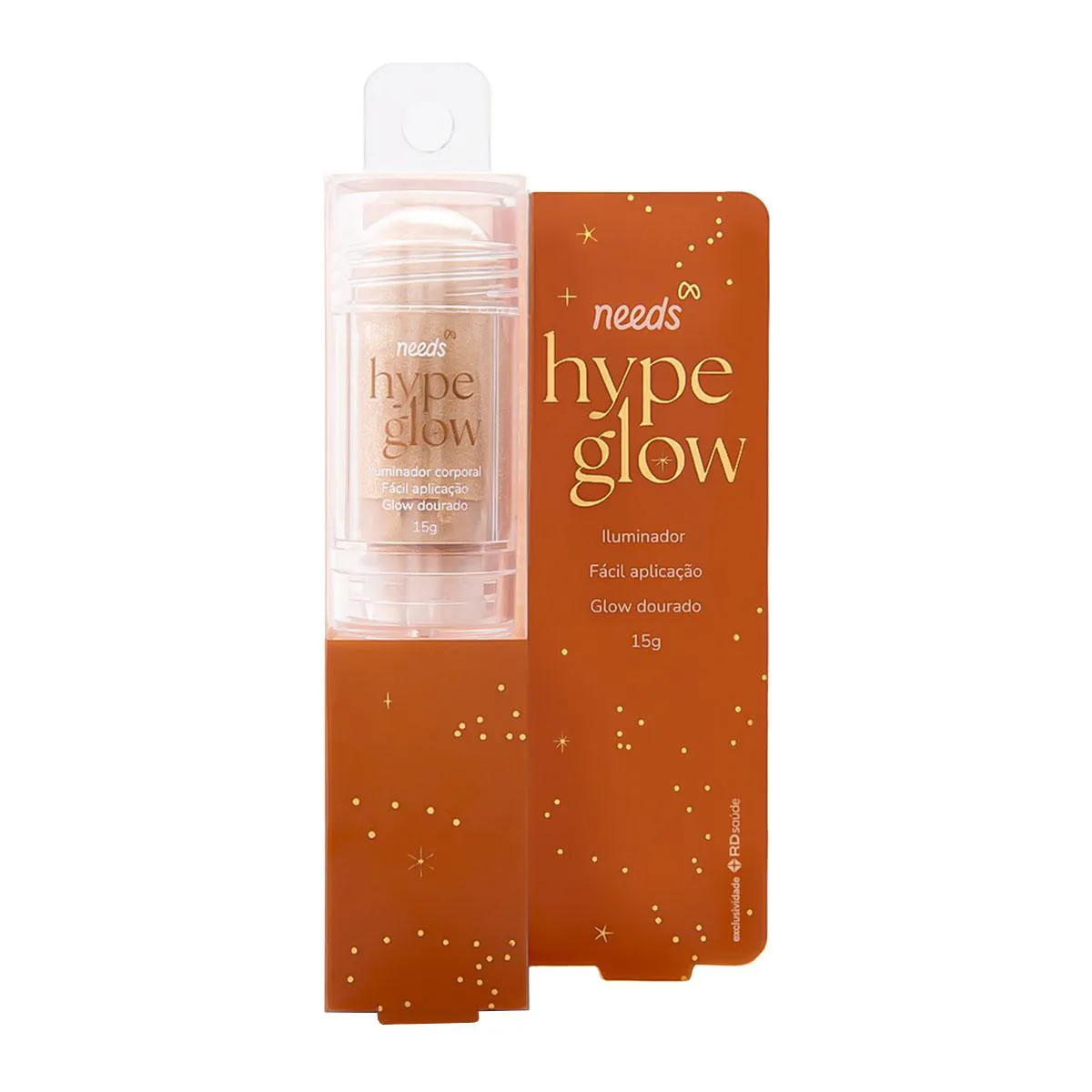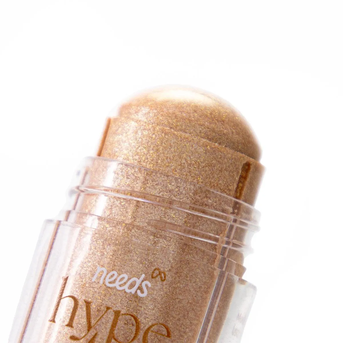 - Iluminador Needs em Bastão Corporal e Facial Hype Glow realça a pele com glow dourado e acabamento natural.