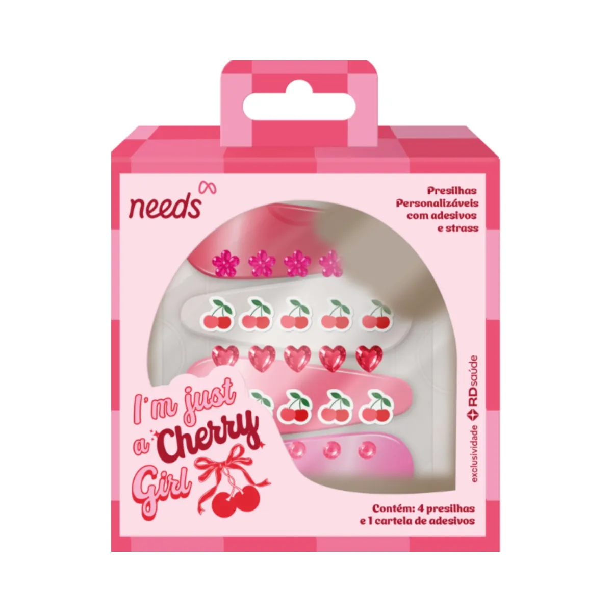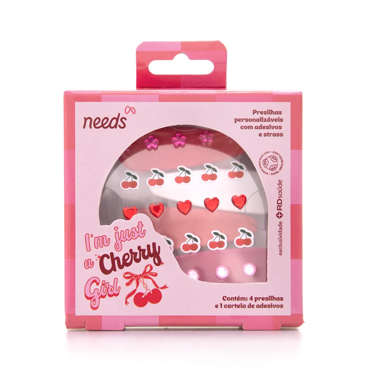 O Kit de Tic Tac Needs Cherry é um acessório decorativo para cabelo que permite personalização criativa, composto por tic-tacs, adesivos e strass para criar diferentes penteados e looks exclusivos.