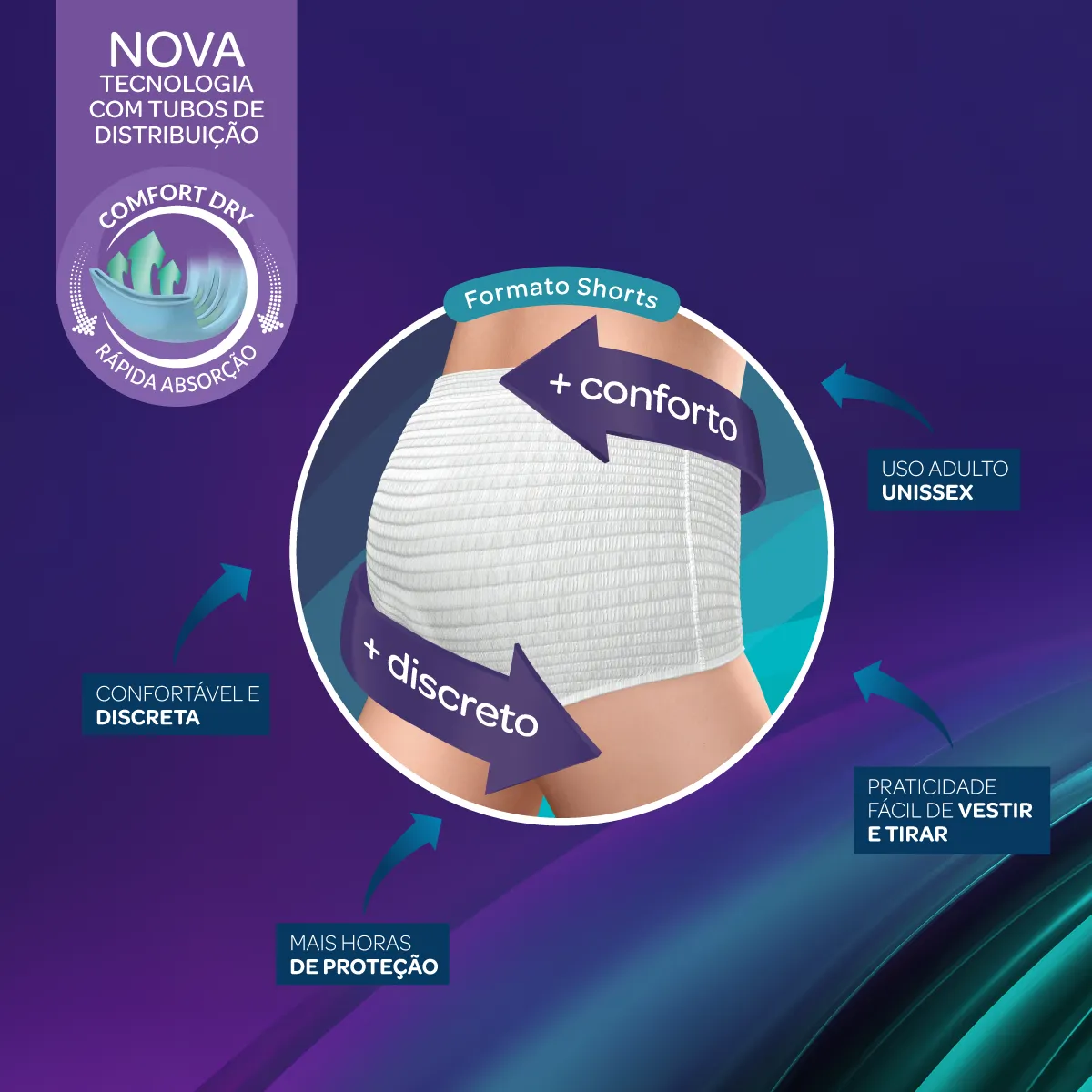 São roupas íntimas descartáveis unissex, indicadas para casos de incontinência com fluxo intenso. Conta com excelente absorção, neutralizador de odores e barreiras antivazamento, além de possuir o ajuste perfeito e ser super discreto. Com ela, você mantém uma vida ativa com mais praticidade no seu dia a dia. Testado dermatologicamente e hipoalergênico.