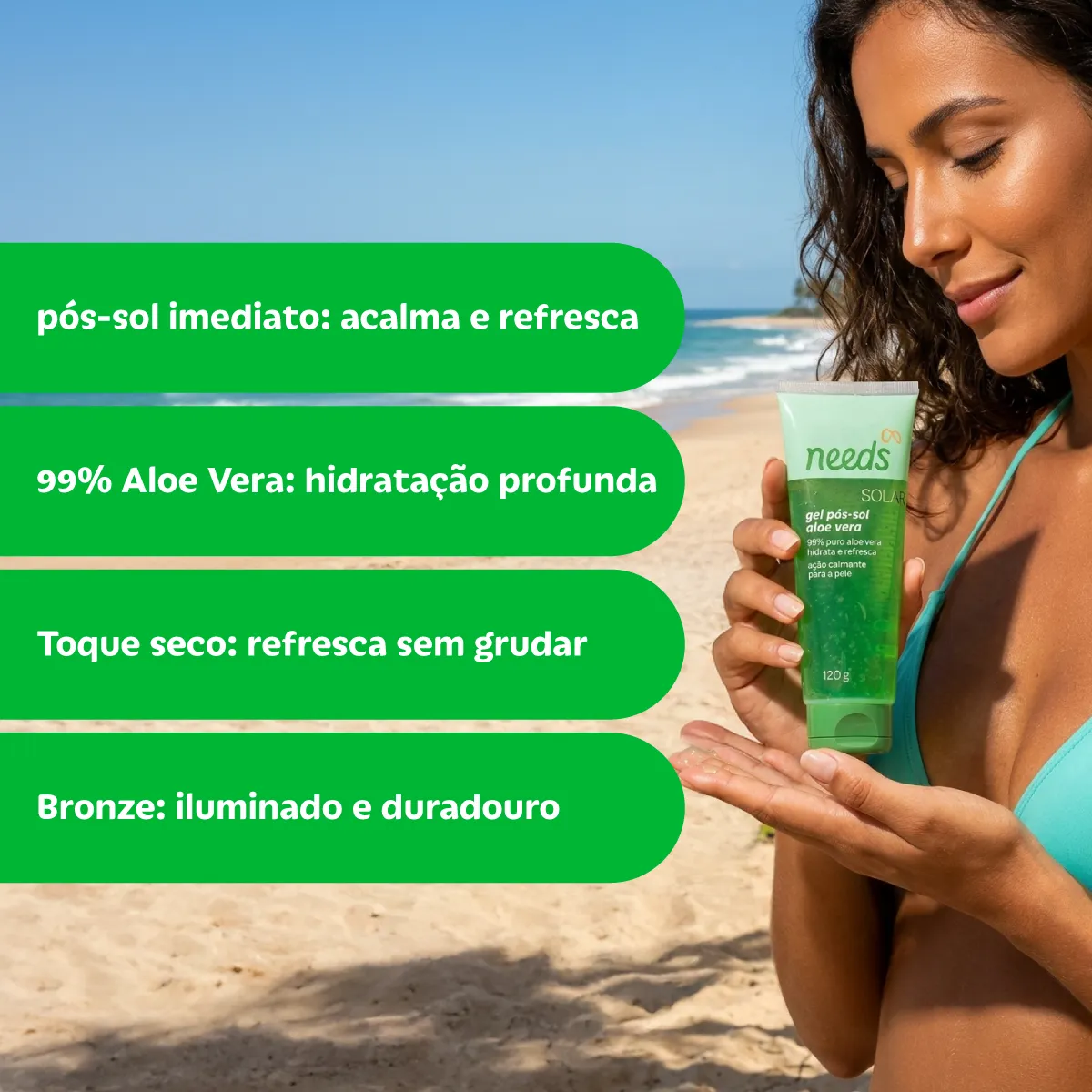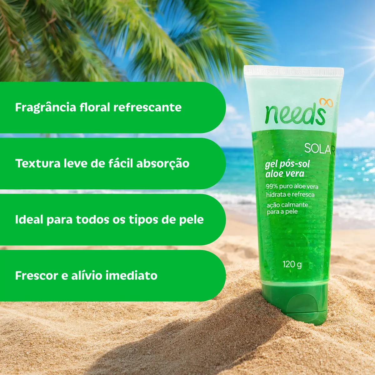 O Gel Pós-Sol Needs Solar Aloe Vera é um produto cosmético desenvolvido especialmente para cuidados pós-exposição solar, composto por 99% de Aloe Vera (Babosa). Sua fórmula possui textura de fácil absorção e fragrância floral refrescante.