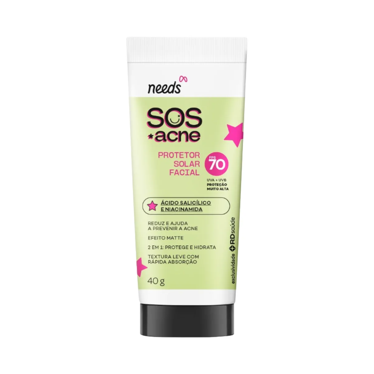O Protetor Solar Needs SOS Acne é um protetor facial desenvolvido especialmente para peles oleosas e acneicas. Sua fórmula dermatológica combina Ácido Salicílico e Niacinamida, ativos que auxiliam no controle da oleosidade, na prevenção da acne e na uniformização da pele. Além de oferecer proteção solar muito alta com FPS 70, o produto ajuda a prevenir o envelhecimento precoce e promove uma pele mais saudável, seca e protegida ao longo do dia.