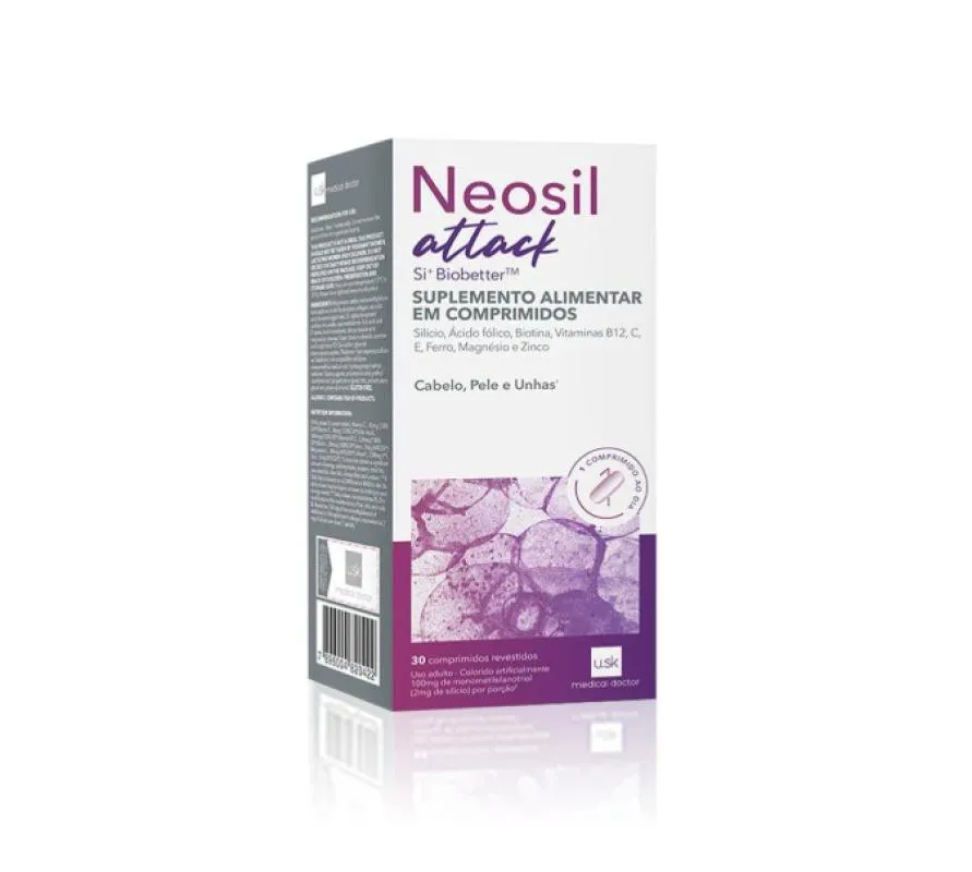 - O Neosil Attack é um suplemento alimentar em comprimidos desenvolvido pela Under Skin, cuja fórmula contém Si+Biobetter. - Uma combinação exclusiva de Silício com colágeno, além de Ácido Fólico, Biotina, Ferro, Magnésio, Zinco e vitaminas B12, C e E. - Juntos, esses ativos atuam de diferentes formas, auxiliando nos cuidados com a pele, unhas e cabelo. - Pele Combatem os danos causados pelos radicais livres, evitando o envelhecimento precoce. - Unhas Regeneram e estimulam o crescimento saudável das unhas. - Cabelo Atuam na revitalização do cabelo, oferecendo mais elasticidade, força e brilho. - Ainda, previne a queda dos fios e aumenta a sua espessura, acelerando a regeneração capilar.