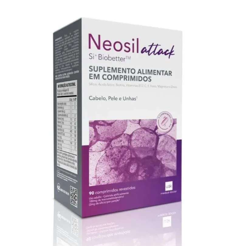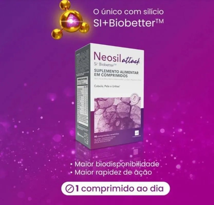 - O Neosil Attack é um suplemento alimentar em comprimidos desenvolvido pela Under Skin, cuja fórmula contém Si+Biobetter. - Uma combinação exclusiva de Silício com colágeno, além de Ácido Fólico, Biotina, Ferro, Magnésio, Zinco e vitaminas B12, C e E. - Juntos, esses ativos atuam de diferentes formas, auxiliando nos cuidados com a pele, unhas e cabelo. - Pele Combatem os danos causados pelos radicais livres, evitando o envelhecimento precoce. - Unhas Regeneram e estimulam o crescimento saudável das unhas. - Cabelo Atuam na revitalização do cabelo, oferecendo mais elasticidade, força e brilho. - Ainda, previne a queda dos fios e aumenta a sua espessura, acelerando a regeneração capilar.