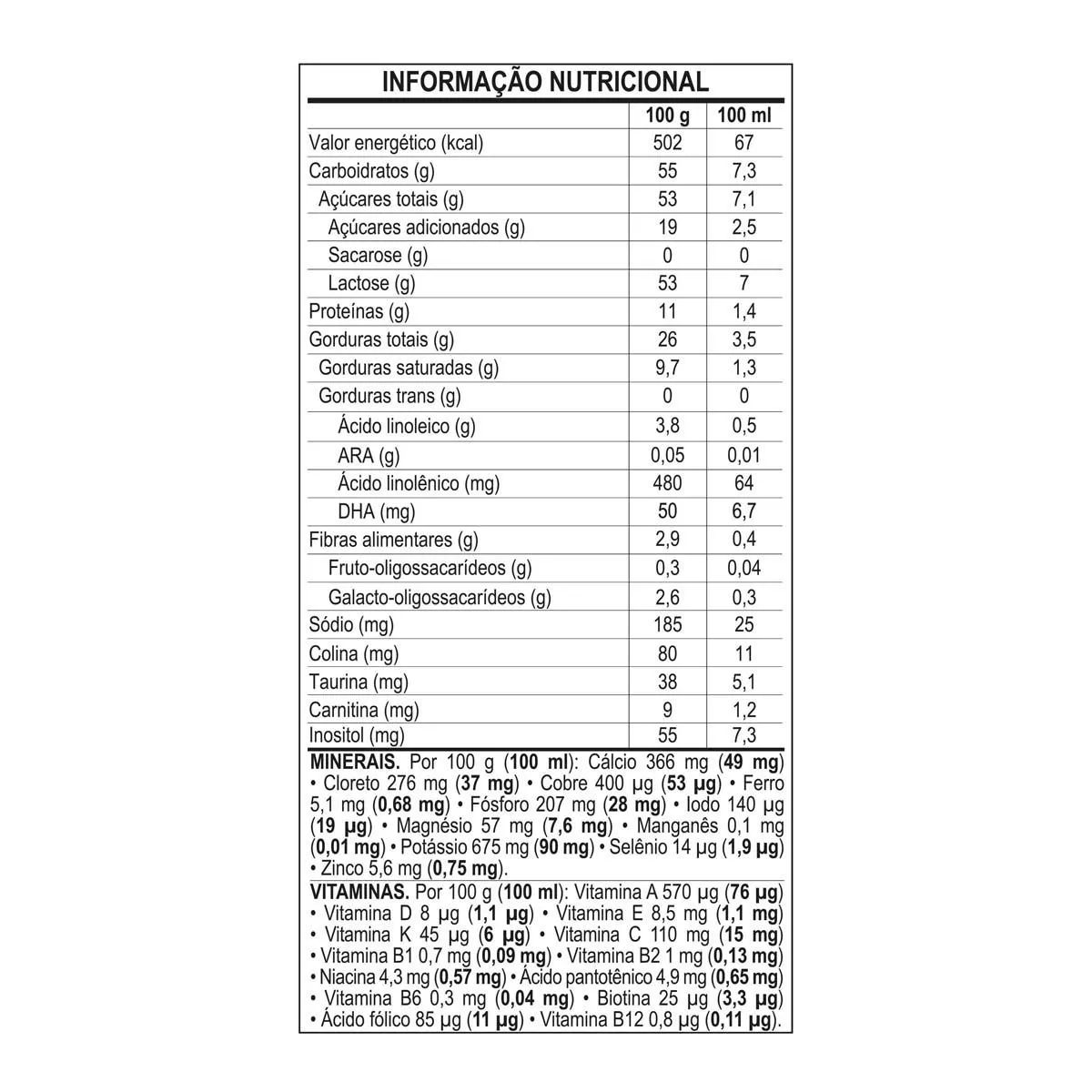 Soro de leite desmineralizado*, leite desnatado*, maltodextrina, oleína de palma, galacto-oligossacarídeos, óleo de palmiste, óleo de canola com baixo teor erúcico, óleo de milho, minerais (citrato de cálcio, cloreto de magnésio, cloreto de sódio, fosfato de sódio dibásico, cloreto de potássio, sulfato ferroso, sulfato de zinco, sulfato de cobre, citrato de potássio, sulfato de manganês, iodeto de potássio, selenato de sódio), fruto-oligossacarídeos, vitaminas (L-ascorbato de sódio, mio-inositol, acetato de DL-α-tocoferila, nicotinamida, D-pantotenato de cálcio, tiamina mononitrato, acetato de retinila, cloridrato de piridoxina, riboflavina, ácido N-pteroil-L-glutâmico, filoquinona, D-biotina, colecalciferol e cianocobalamina), taurina, L-carnitina, emulsificante lecitina de soja e reguladores de acidez hidróxido de potássio e ácido cítrico.