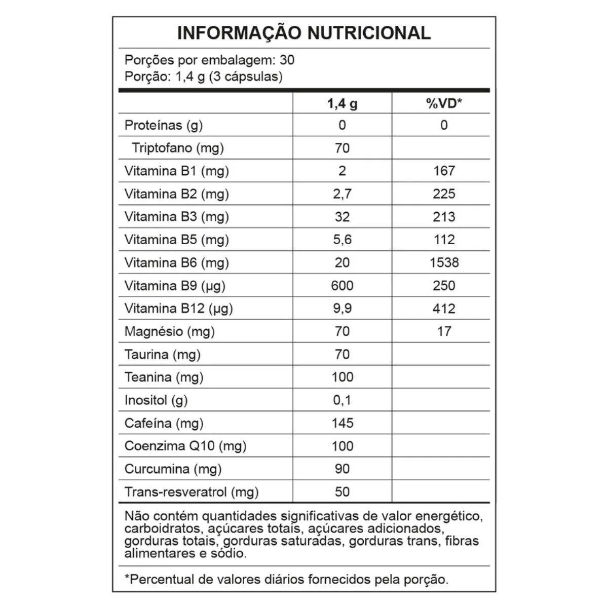 - Contém cafeína de liberação estendida e taurina.
