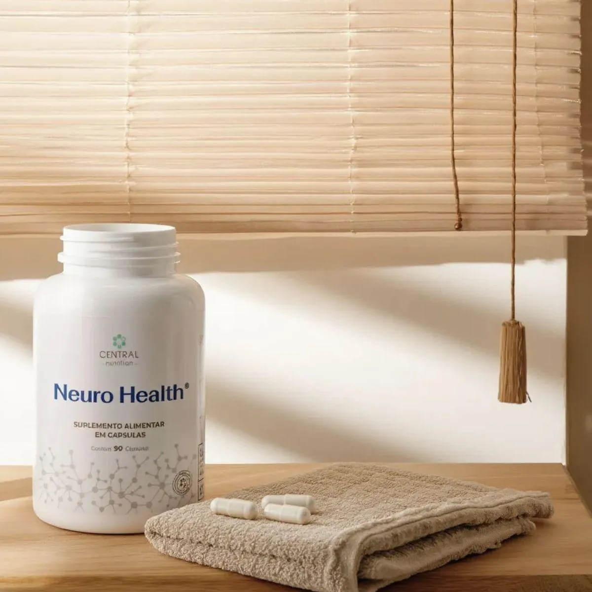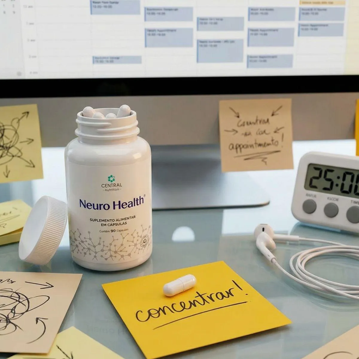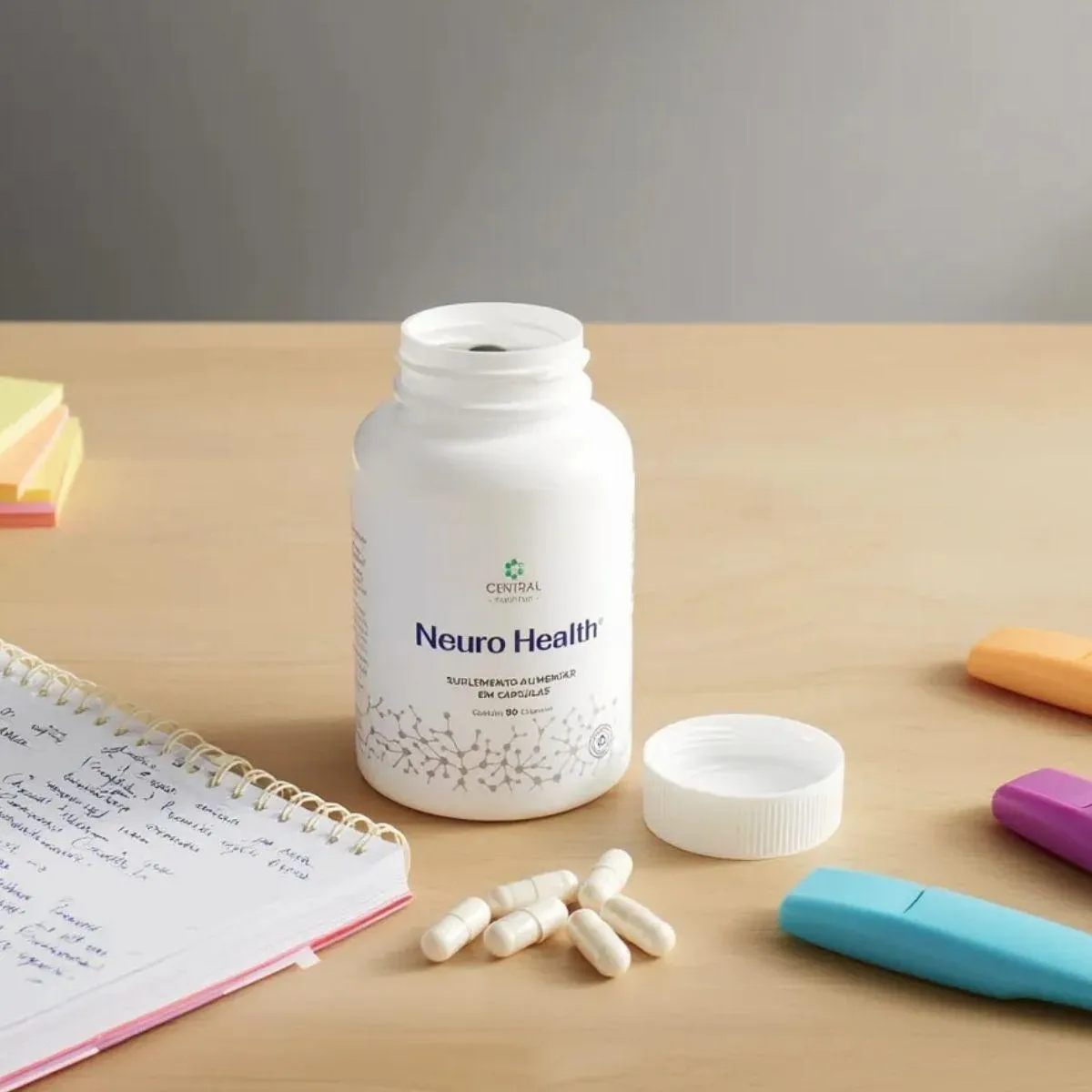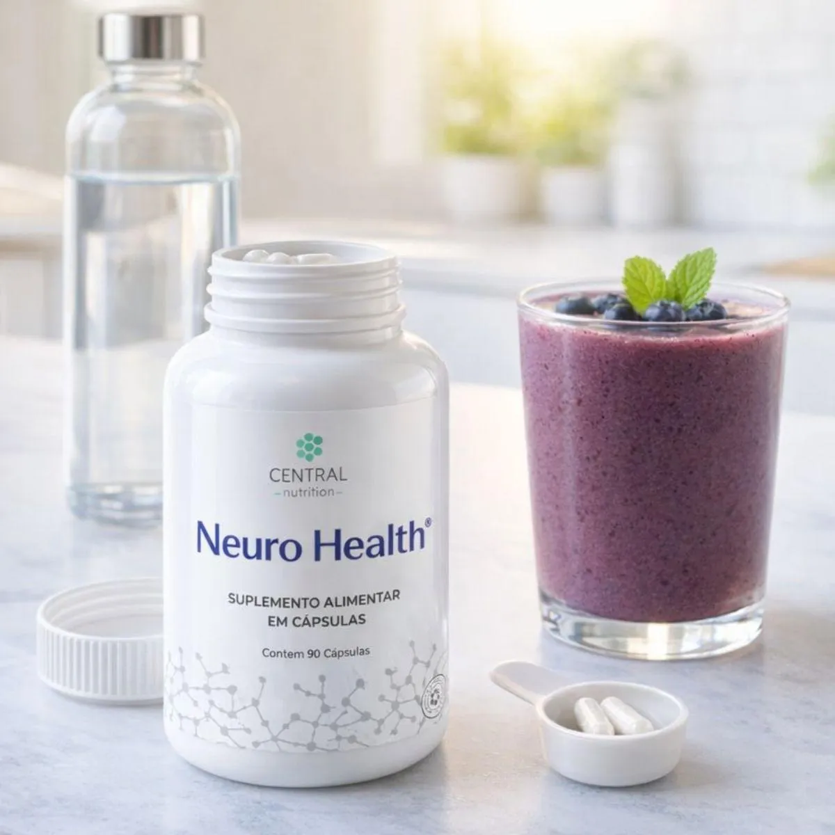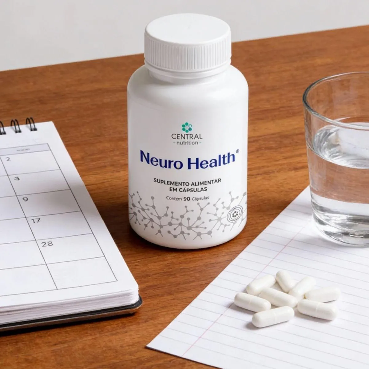 Neuro Health da Central Nutrition é um complexo em cápsulas que reúne magnésio bisglicinato, cafeína de liberação estendida, taurina, N acetilcisteína (NAC), colina bitartarato, coenzima Q10 e extrato de cúrcuma, além de vitaminas B1, B6 e B12. Esses componentes são adicionados em formas biodisponíveis e sem adição de açúcar ou lactose. O produto vem em frasco com 90 cápsulas e utiliza excipientes como hidroxipropilmetilcelulose e celulose microcristalina para assegurar a estabilidade da fórmula. A presença de magnésio bisglicinato e vitaminas do complexo B está associada ao metabolismo energético e ao funcionamento neuromuscular, enquanto a cafeína e a taurina são utilizadas em produtos para suporte de foco e concentração. NAC e colina são doadores de grupos sulfidrila e colina, respectivamente, contribuindo para vias metabólicas específicas. A cúrcuma adiciona compostos fenólicos naturais, e a CoQ10 completa o perfil de nutrientes lipossolúveis. As cápsulas são veganas e isentas de glúten. O fabricante sugere a ingestão de uma a três cápsulas ao dia, preferencialmente antes ou entre as refeições, sempre sob orientação de médico ou nutricionista. Este suplemento não substitui uma dieta equilibrada nem pretende tratar ou curar doenças. Gestantes, lactantes, crianças e pessoas que utilizam medicamentos devem procurar aconselhamento profissional antes de iniciar a suplementação. Guarde em local seco, protegido da luz e fora do alcance de crianças e não ultrapasse a dose diária recomendada.