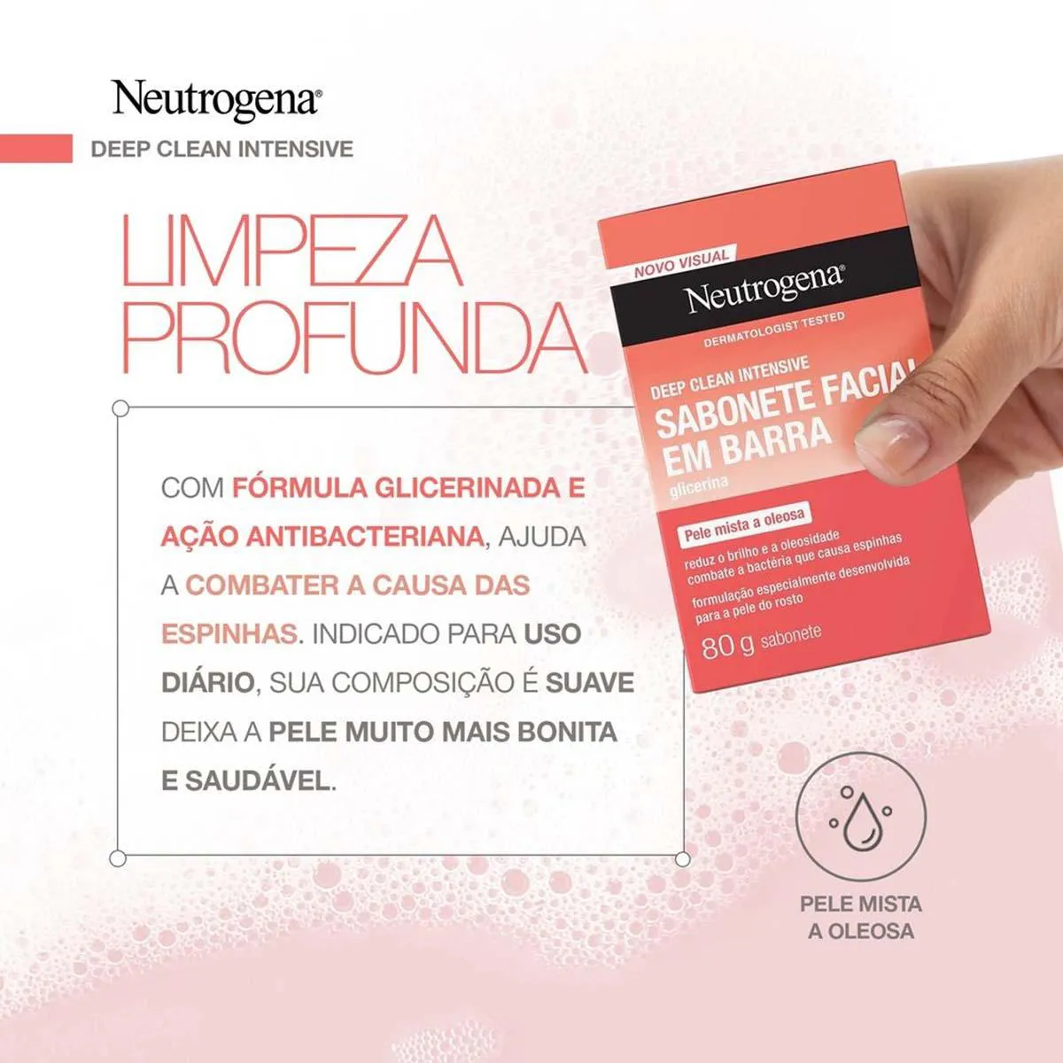 Ideal para peles mistas, oleosas e acneicas, Neutrogena Deep Clean faz uma limpeza profunda, combatendo a oleosidade e espinhas. Possui fórmula glicerinada com triclosan, um antibacteriano que ajuda a combater as bactérias causadoras da acne. Indicado para uso diário, sua composição é suave e promove uma pele bonita e saudável e hidratada.
