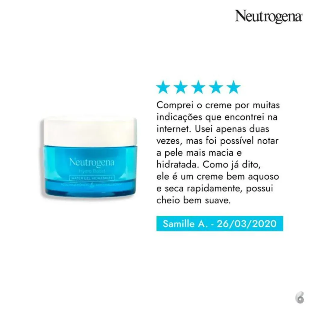 O Neutrogena Hydro Boost Water Gel é um hidratante facial desenvolvido com Ácido Hialurônico, ideal para todos os tipos de pele, especialmente as oleosas. Sua fórmula oil-free, de textura leve, promove uma hidratação profunda e prolongada, ajudando a fortalecer a barreira natural da pele. Ele também controla a oleosidade, deixando a pele renovada, macia e sem resíduos pegajosos. Perfeito para uso diário, o Hydro Boost ajuda a repor a água da pele ao longo do dia, mantendo a sensação de frescor e saúde.