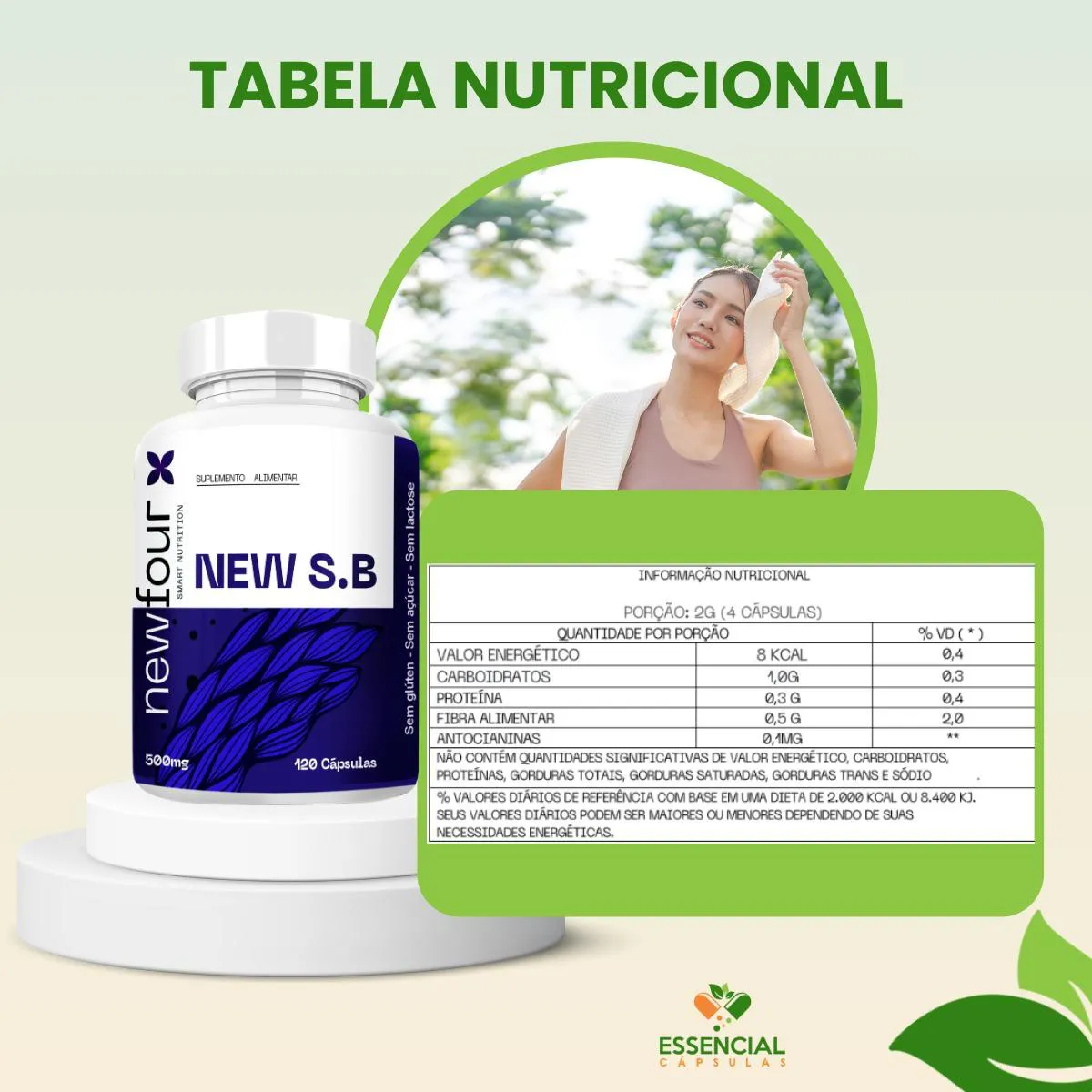BEM VINDO(A) À ESSENCIAL CÁPSULAS Aqui, acreditamos que cuidar da saúde pode (e deve) ser algo natural, leve e diário. PRODUTO: - New S.B MARCA: - NEW FOUR BENEFÍCIOS: ● Muito utilizada em estratégias voltadas ao equilíbrio do peso ● Ideal para quem busca leveza aliada a hábitos saudáveis SUGESTÃO DE CONSUMO (PELO FABRICANTE): - 2 cápsulas, duas vezes ao dia - Diluir em 200ml de água IMPORTANTE SABER: - Este produto é um suplemento alimentar natural. - Não é medicamento e não substitui uma alimentação equilibrada nem o acompanhamento de um profissional da saúde. - Como um produto natural, seus benefícios podem ser vistos a partir de alguns dias do uso. - Os suplementos são destinados a pessoas saudáveis. Sua finalidade é fornecer nutrientes, substâncias bioativas, enzimas ou probióticos em complemento à alimentação. COMPOSIÇÃO: - EXTRATO DE CAFÉ VERDE, LARANJA MORO, PSYLLIUM (PLANTAGO OVATAE), ÁGAR, EXTRATO DE SEMENTE DE FENO GREGO (TRIGONELLA FOENUM - GRAECUM L.), LEVEDURA DE CERVEJA (SACCHAROMYCES CEREVISAE), FRINHA DE ERVILHA (PISUM SATIVUM L.), FIBRA DE BETERRABA, FIBRA DE CASCA DE MAÇÃ, FIBRA DE CASCA DE AVEIA, EXTRATO SECO DE SEMENTE DE UVA, PROTEÍNA DA SOJA, ACEROLA EM PÓ, GOMA- GUAR. NÃO CONTÉM GLÚTEN CONTRAINDICAÇÃO: - O uso não é recomendado para gestantes, lactantes e crianças. - Em caso de uso contínuo de medicamentos ou condições específicas de saúde, busque a orientação de um profissional da saúde. QUALIDADE: - Sabemos que o mercado de suplementos é competitivo, com opções para todos os públicos e faixas de preço. Na nossa loja, priorizamos a qualidade em cada detalhe. Por isso, escolhemos trabalhar apenas com fábricas que utilizam matérias-primas de excelência e seguem rigorosos padrões de produção. ENVIAMOS RAPIDINHO: - Seu pedido é preparado com todo cuidado e postado em até 24 horas úteis após a confirmação da compra. (Na maioria das vezes, enviamos bem antes disso)! FALE CONOSCO: Tem dúvidas ou quer conversar sobre o produto? Nosso atendimento é humanizado e está sempre pronto para te ouvir com muita atenção!
