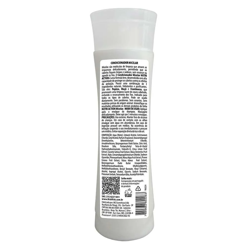 O Nick E Vick Condicionador Micelar é um produto capilar desenvolvido com micelas e ativos naturais como maçã, pepino, limão, framboesa e Phytolan. Sua fórmula é vegana, sem parabenos e sem corantes, com o objetivo de limpar, hidratar e nutrir os cabelos de forma delicada, removendo oleosidade e impurezas sem ressecar os fios.