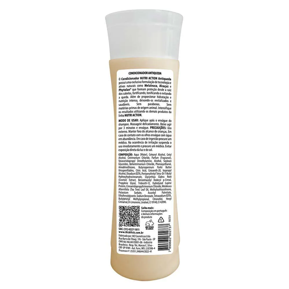 O Nick & Vick Antiqueda Condicionador é um produto capilar desenvolvido com ativos naturais como Melaleuca, Alcaçuz e Phytolan, destinado especificamente para cabelos com tendência à queda, quebradiços e com pontas duplas. Sua formulação exclusiva visa proteger os fios a partir da raiz, oferecendo nutrição e força capilar.