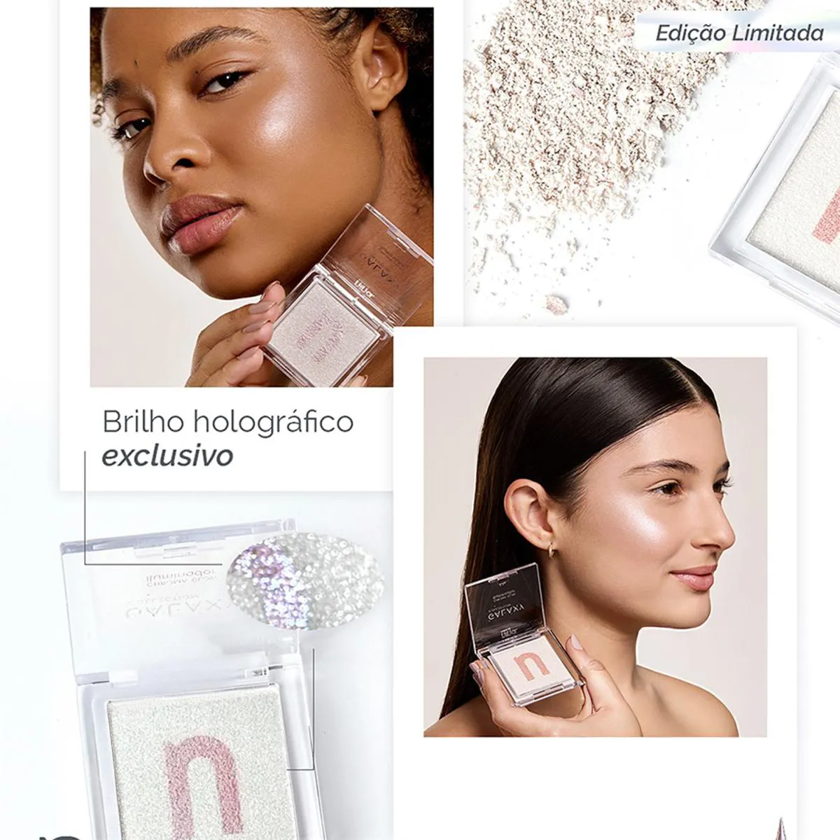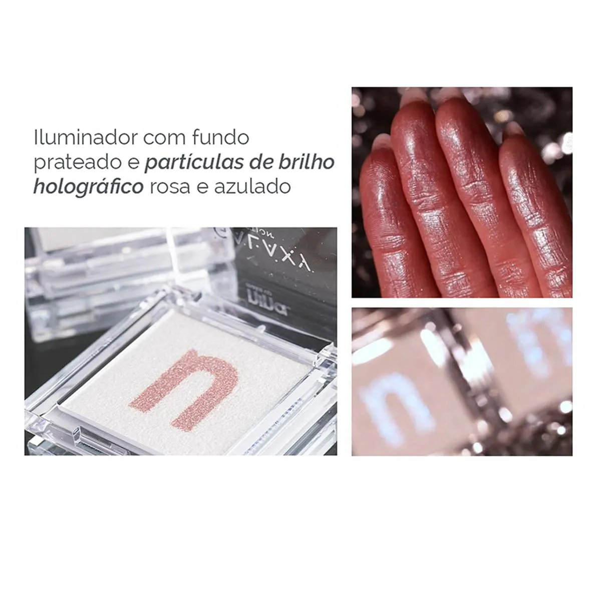 O Iluminador Galaxy Plutão Nina Makeup entrega um brilho holográfico com brilho e fundo perolado, transforma a pele em pura luminosidade.