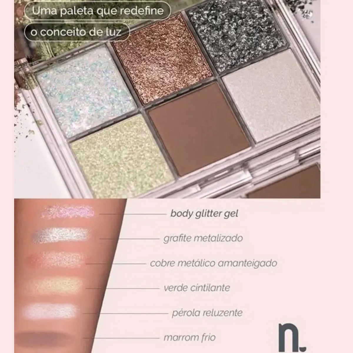 A Paleta Ursa Maior Galaxy Nina Makeup traz seis cores exclusivas, do matte elegante ao brilho intenso do Body Glitter Gel prensado — uma inovação inédita no Brasil.