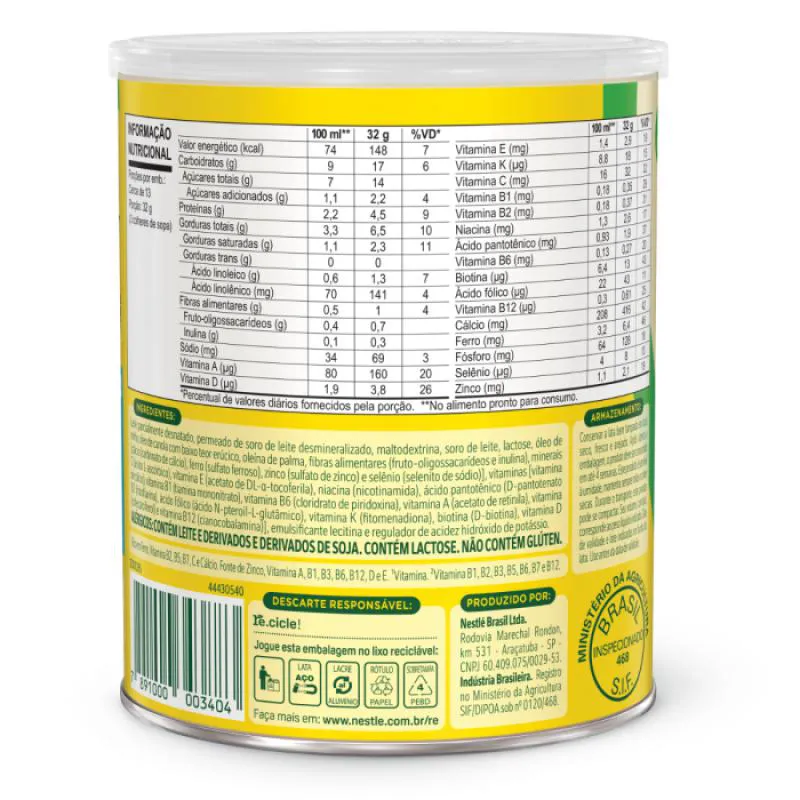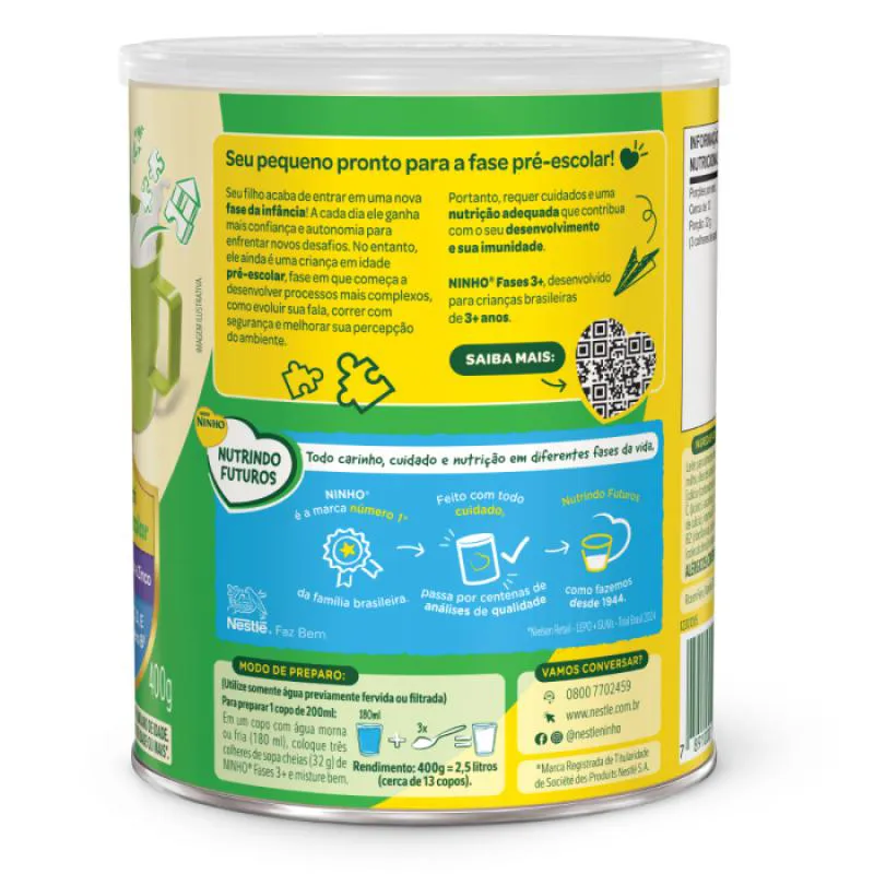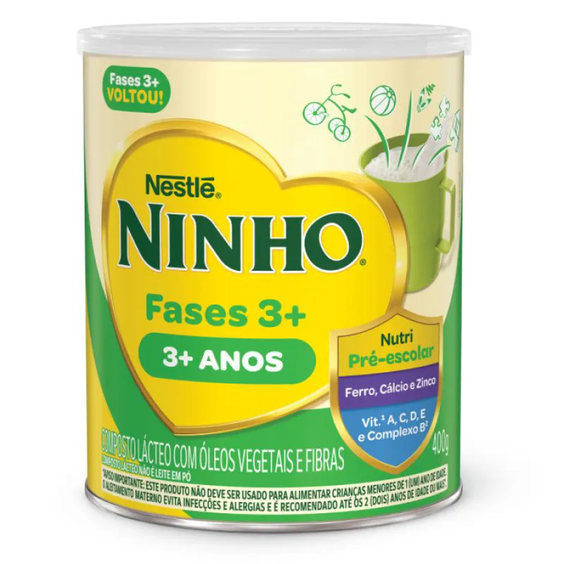 NINHO Fases 3+ é um Composto Lácteo com óleos vegetais e fibras, nutricionalmente adequado para crianças de 3 a 5 anos. Possui Vitaminas e minerais que contribuem para esta fase de crescimento e desenvolvimento da criança.AVISO IMPORTANTE: ESTE PRODUTO NÃO DEVE SER USADO PARA ALIMENTAR CRIANÇAS MENORES DE 1 (UM) ANO DE IDADE. O ALEITAMENTO MATERNO EVITA INFECÇÕES E ALERGIAS E É RECOMENDADO ATÉ OS 2 (DOIS) ANOS DE IDADE OU MAIS