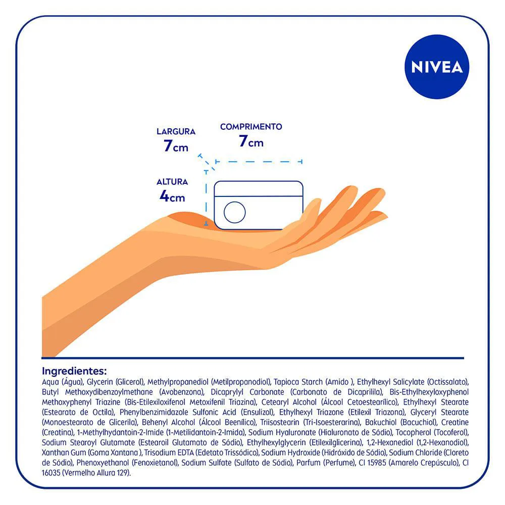 Sua fórmula conta com BAKUCHIOL PURO, a nova geração de ativos anti-idade de NIVEA. Este ativo revolucionário estimula a produção de colágeno e ajuda a redensificar e fortalecer as fibras de sustentação da pele. * Também conta com 2 tipos de ácido hialurônico, consagrados ativos anti-idade, conhecidos por hidratar, suavizar a pele e reduzir visivelmente as rugas profundas.