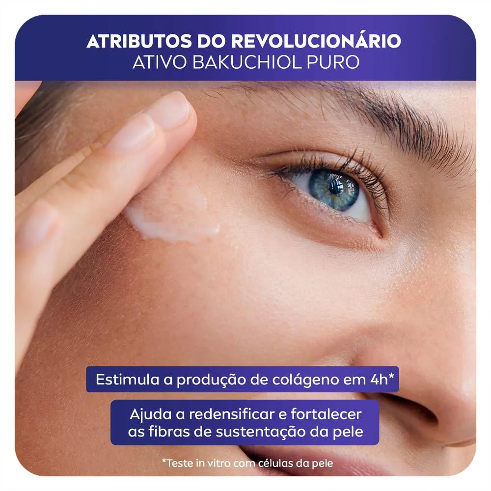Sua fórmula conta com BAKUCHIOL PURO, a nova geração de ativos anti-idade de NIVEA. Este ativo revolucionário estimula a produção de colágeno e ajuda a redensificar e fortalecer as fibras de sustentação da pele. * Também conta com 2 tipos de ÁCIDO HIALURÔNICO, consagrados ativos anti-idade, conhecidos por hidratar, suavizar a pele e reduzir visivelmente as rugas profundas.
