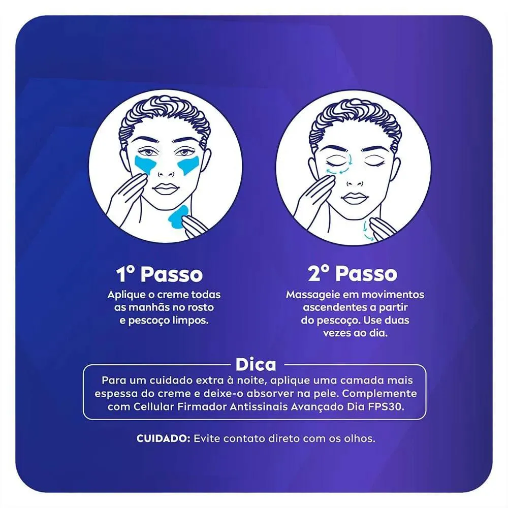 Aplique o creme todas as noites no rosto e pescoço limpos. Evite o contato direto com os olhos. Massageie em movimentos ascendentes a partir do pescoço. Para um cuidado extra à noite, aplique uma camada mais espessa do creme e deixe-o absorver na pele. Complemente com Cellular Firmador Antissinais Avançado Dia FPS30.