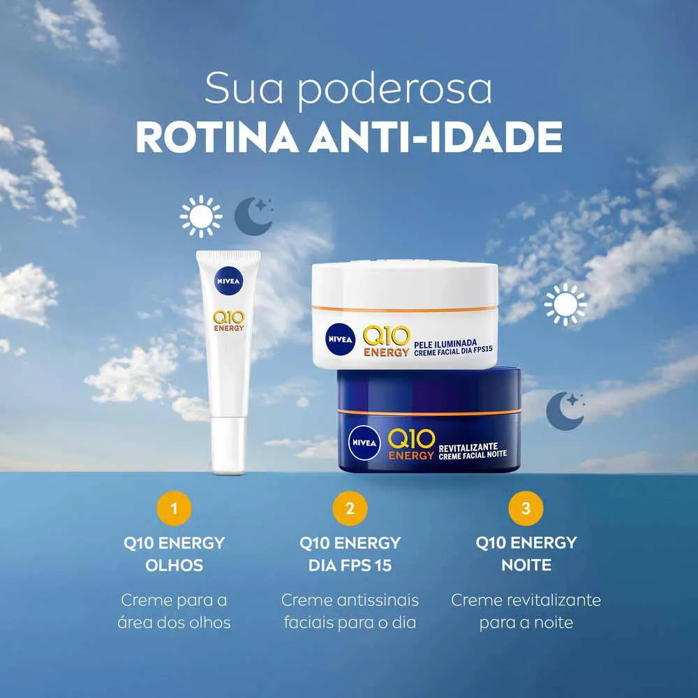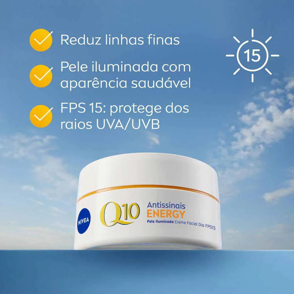 O que é? NIVEA Creme Facial Antissinais Q10 Energy Dia FPS15 é um creme facial que reduz as rugas em 4 semanas, deixando a pele mais firme.