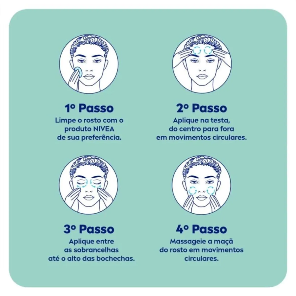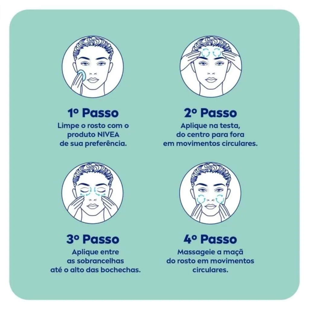 Lavar o rosto com o NIVEA Sabonete em Gel Controle do Brilho. Aplique o NIVEA Tônico Adstringente Controle do Brilho com um disco de algodão no rosto, pescoço e colo. Aplique NIVEA Q10 Plus Antissinais Creme Facial Pele Mista a Oleosa FPS 30 duas vezes ao dia.