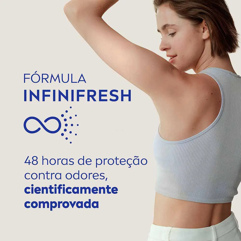 A exclusiva fórmula Nivea Infini Fresh ajuda a controlar a produção de suor, proporcionando frescor duradouro com 48h de proteção e ação antibacteriana. Uma opção ideal para pessoas com maior sensibilidade à irritações na pele.