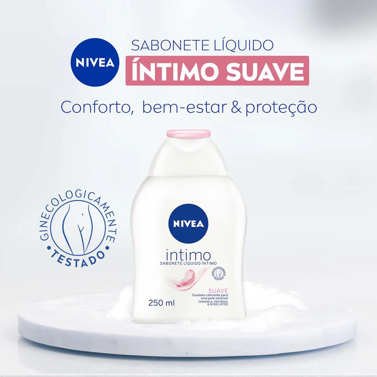 O Sabonete Líquido Íntimo Nivea Suave formulado com Extrato de Camomila, Panthenol e Ácido Lático, ingredientes que, quando combinados, formam uma espuma delicada que limpa suavemente a região íntima da mulher, mantendo o seu pH natural e oferecendo sensação de conforto, proteção e bem-estar diário.